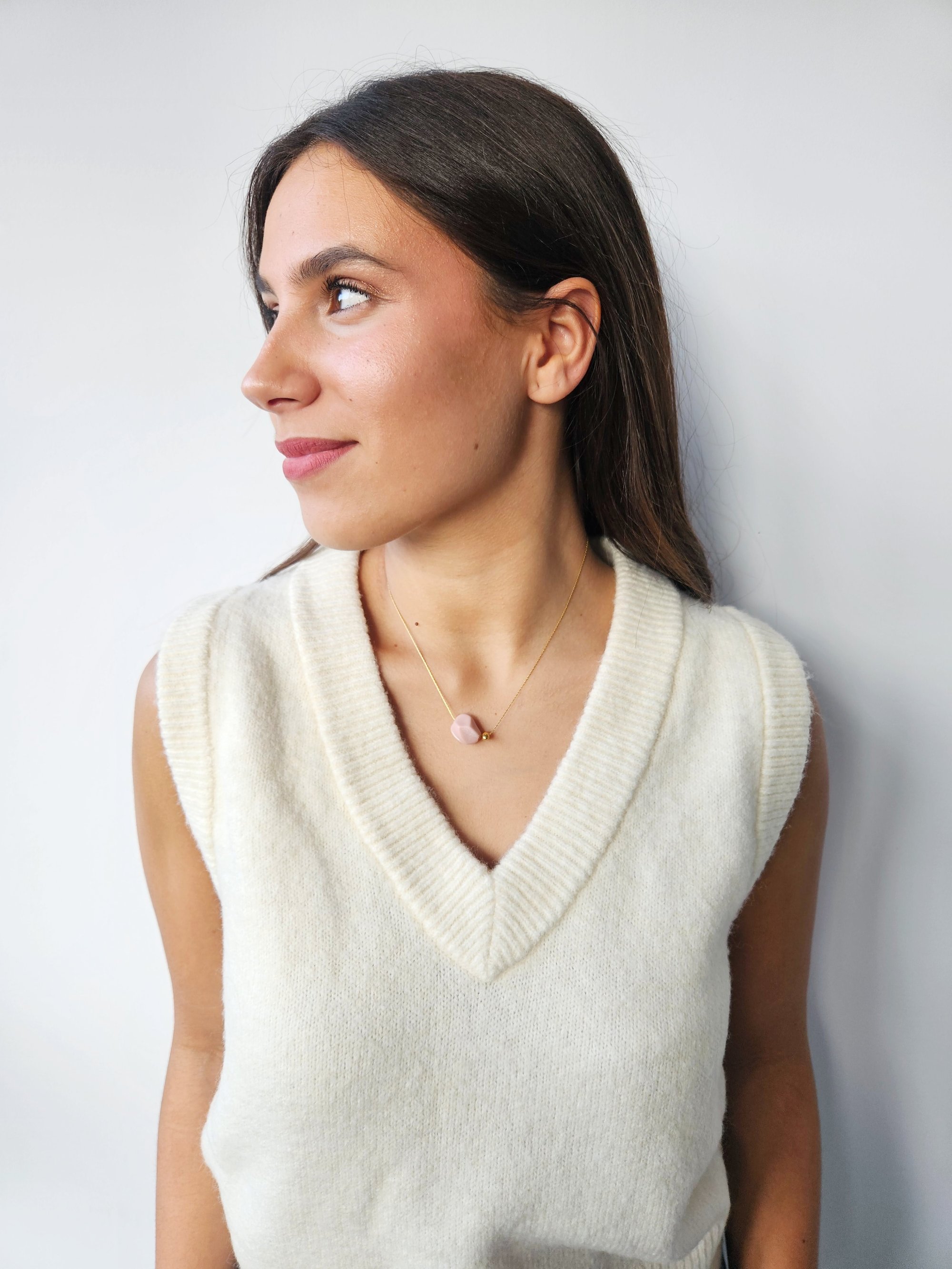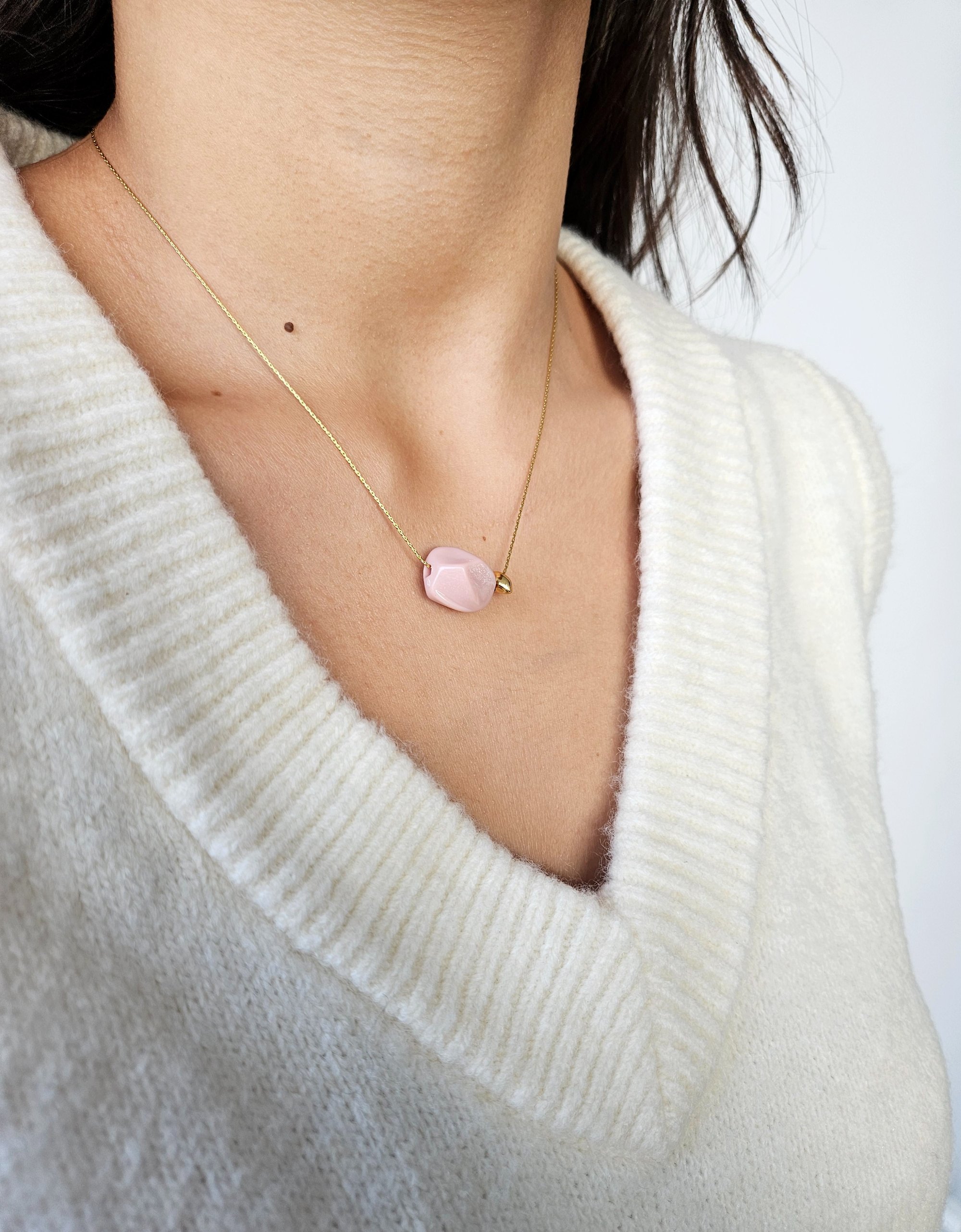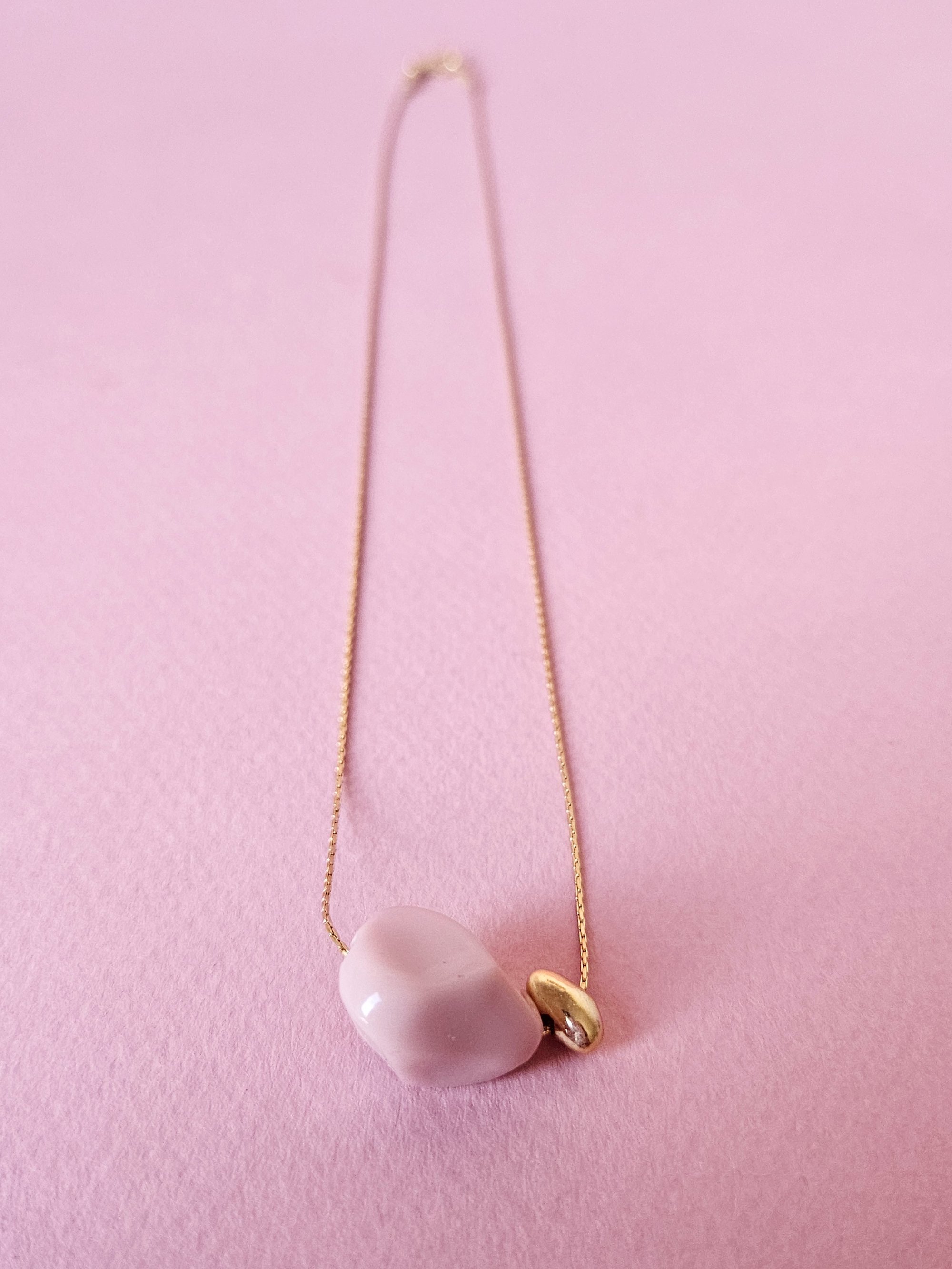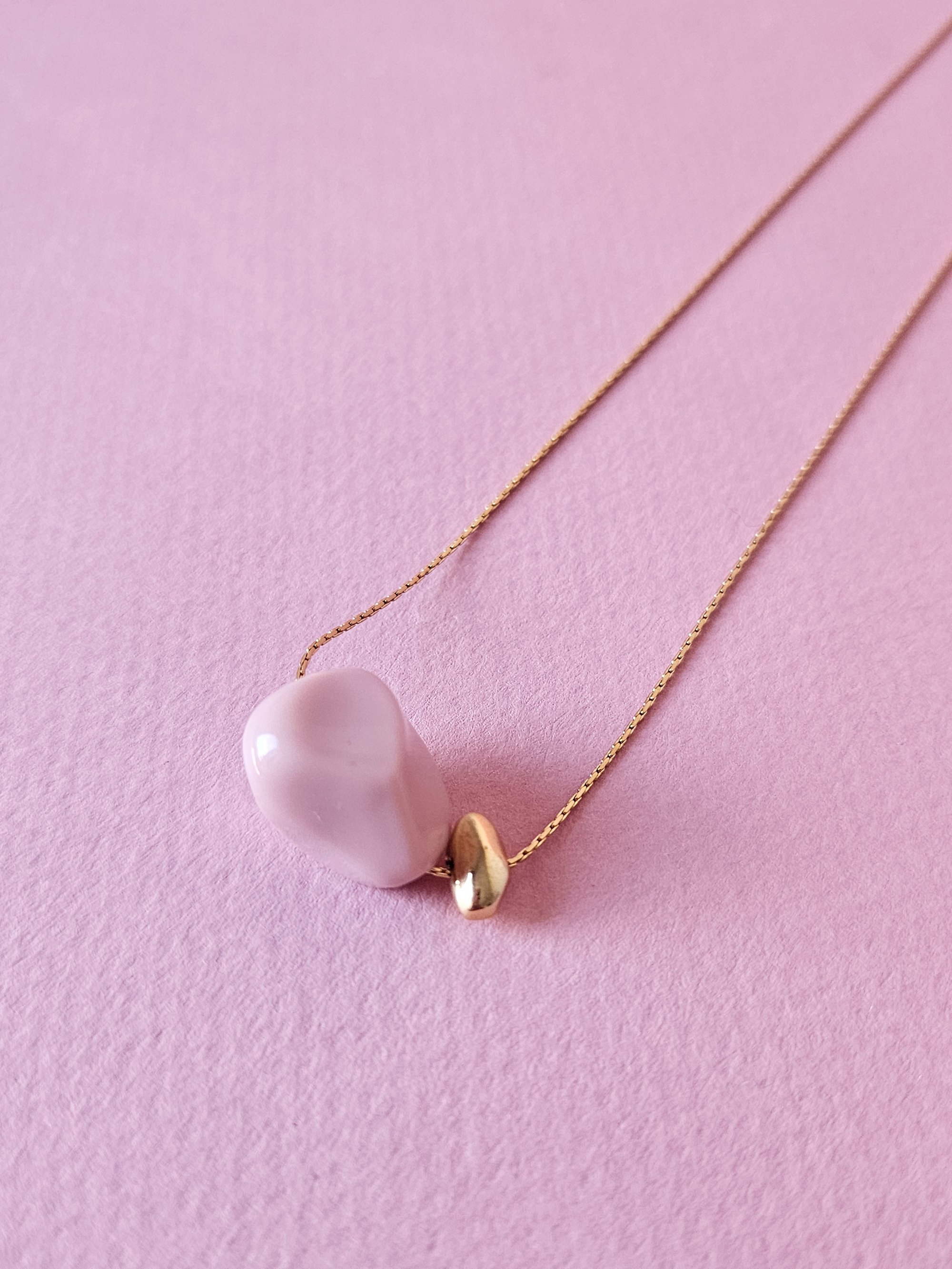 El colgante GALA está compuesto por una pieza de resina en tono nude y una pequeña pieza de latón bañada en oro.