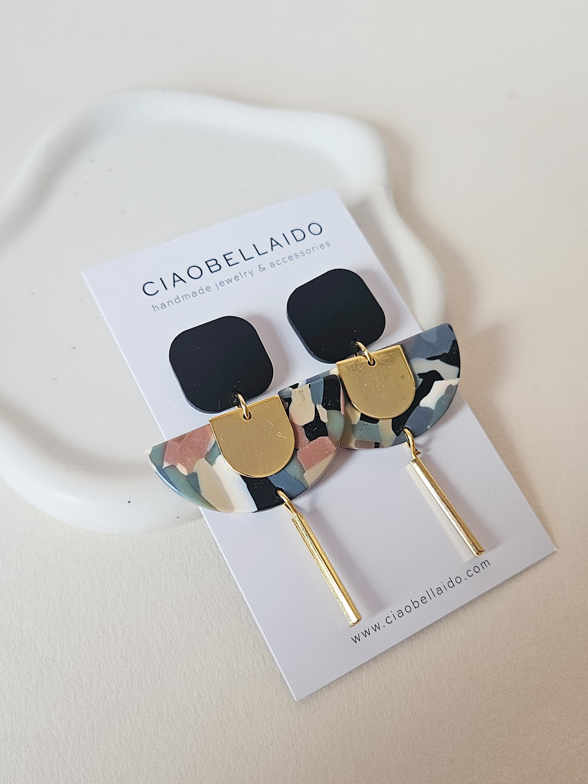 Los pendientes AFRIKA-GOLD están compuestos por dos piezas de resina en tonos beige, marró, gris y negro, junto a varias piezas doradas . Cierre a presión de latón bañado en oro, libre de níquel y plomo. Medida 5.8x3.5cm