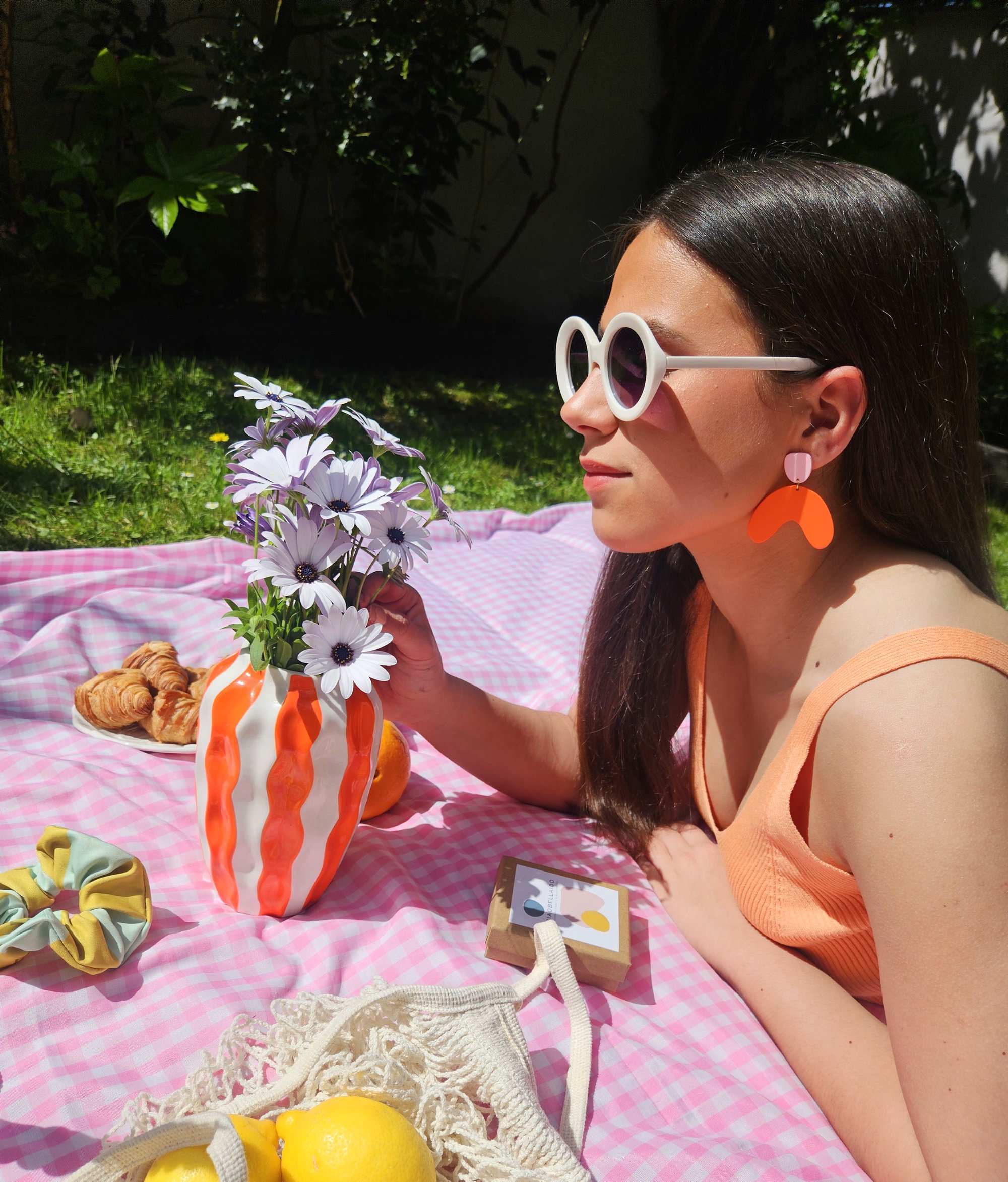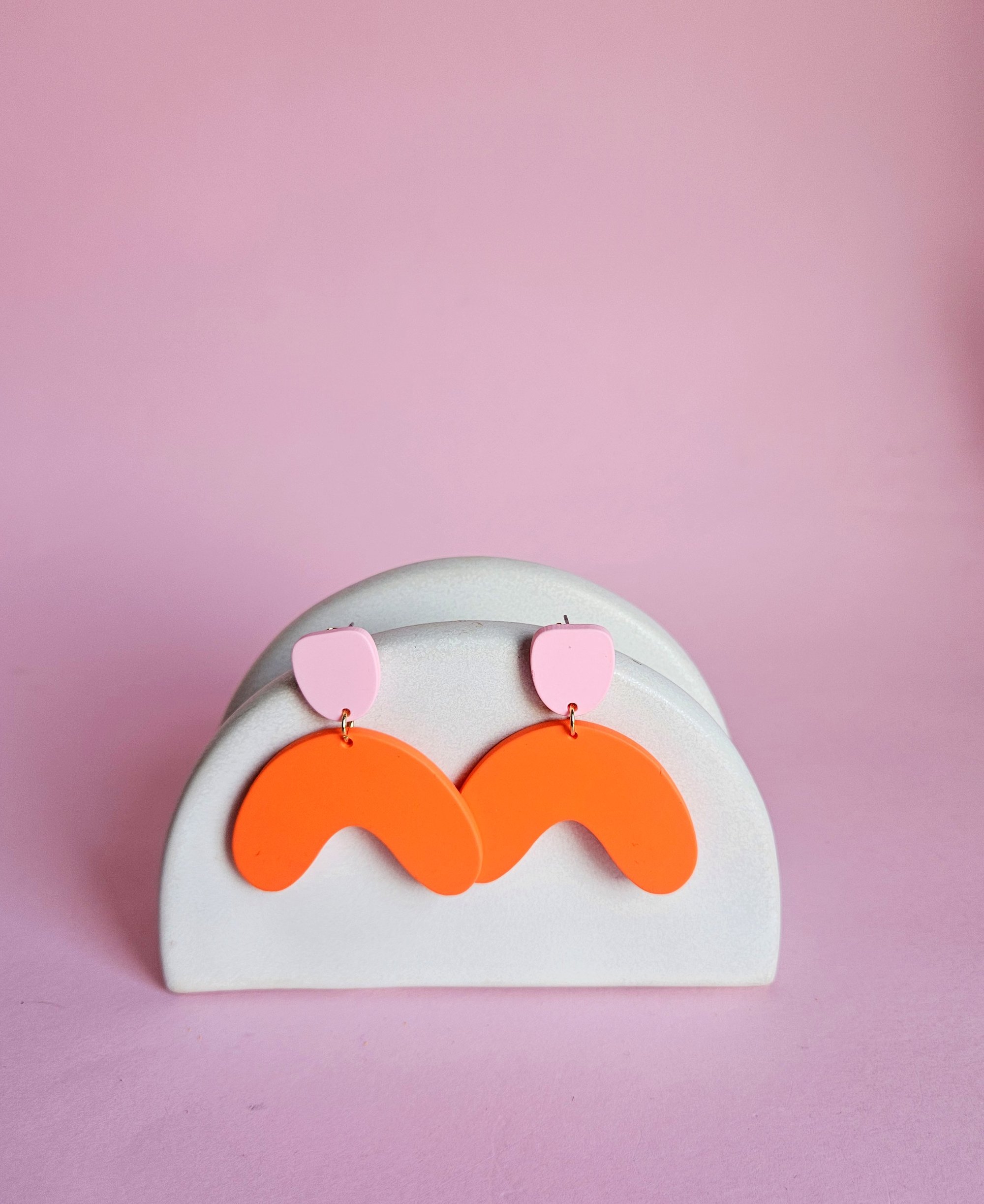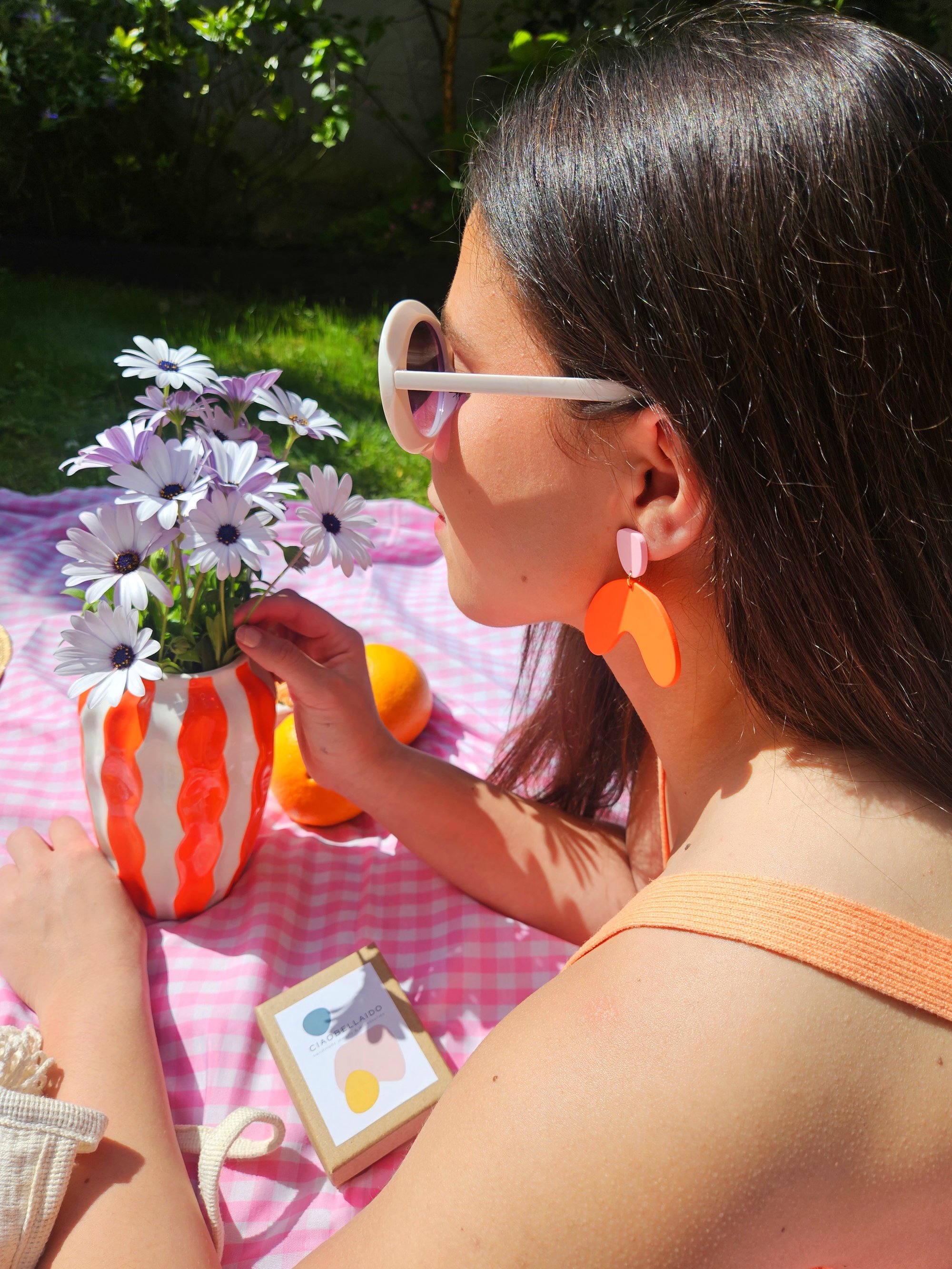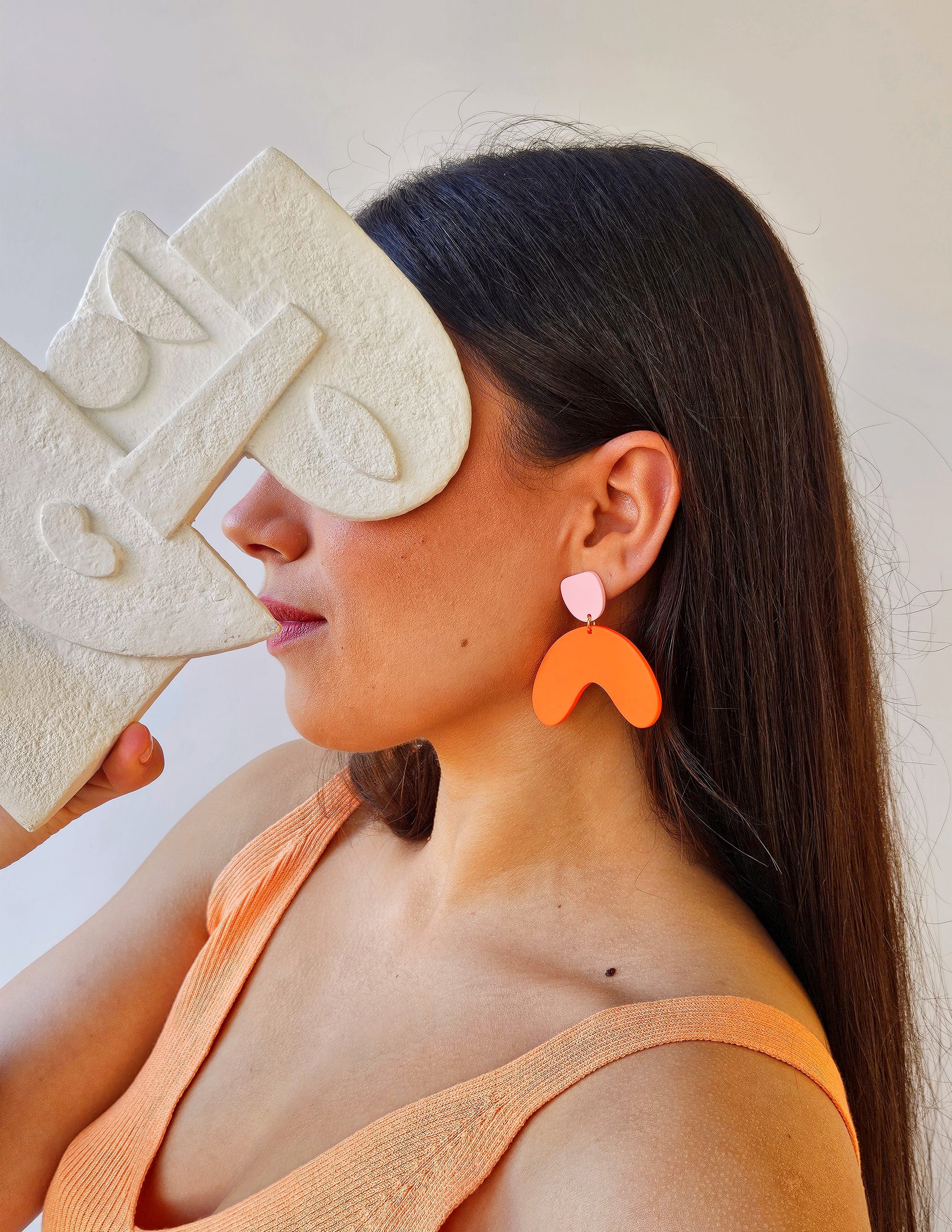 Los pendientes ARIANE están compuestos por dos piezas de acrílico en tonos rosas y coral. Muy ligeros. Sus medidas son 5x4,5 cm. Cierre a presión de latón bañado en oro, libre de níquel y plomo