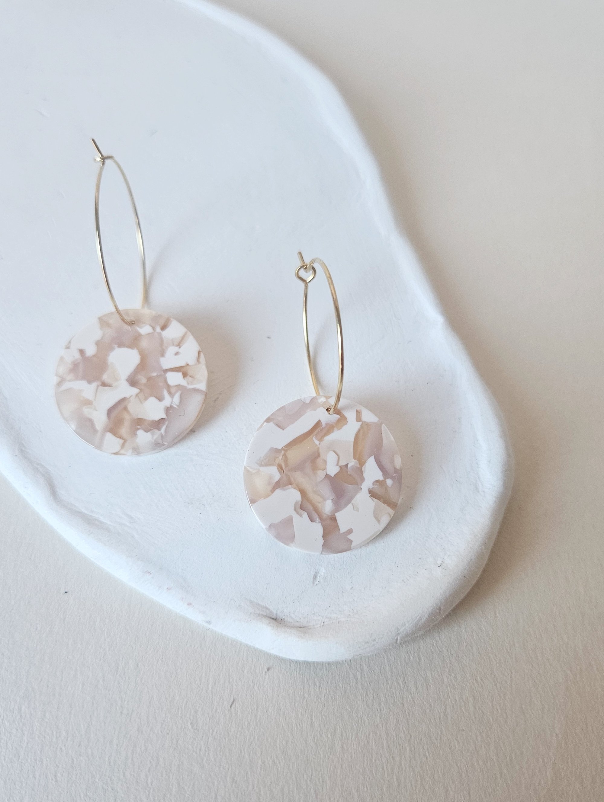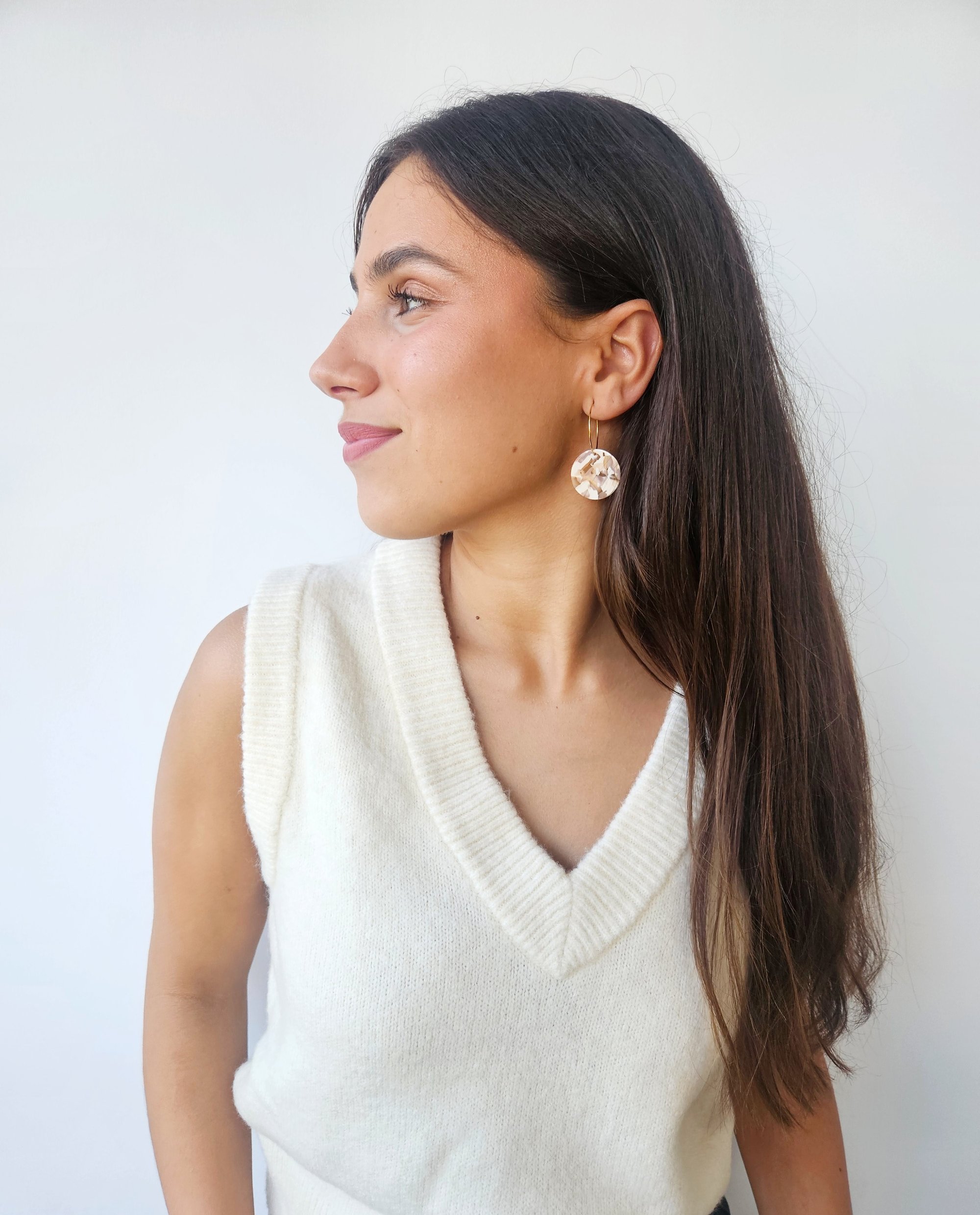 Los pendientes CREAM están compuestos por un aro pequeño con un diámetro de 2,5 cm. El aro es de latón bañado en oro (libre de níquel y plomo) . La pieza de resina redonda en tonos beiges tiene un diámetro de 2,3 cms.