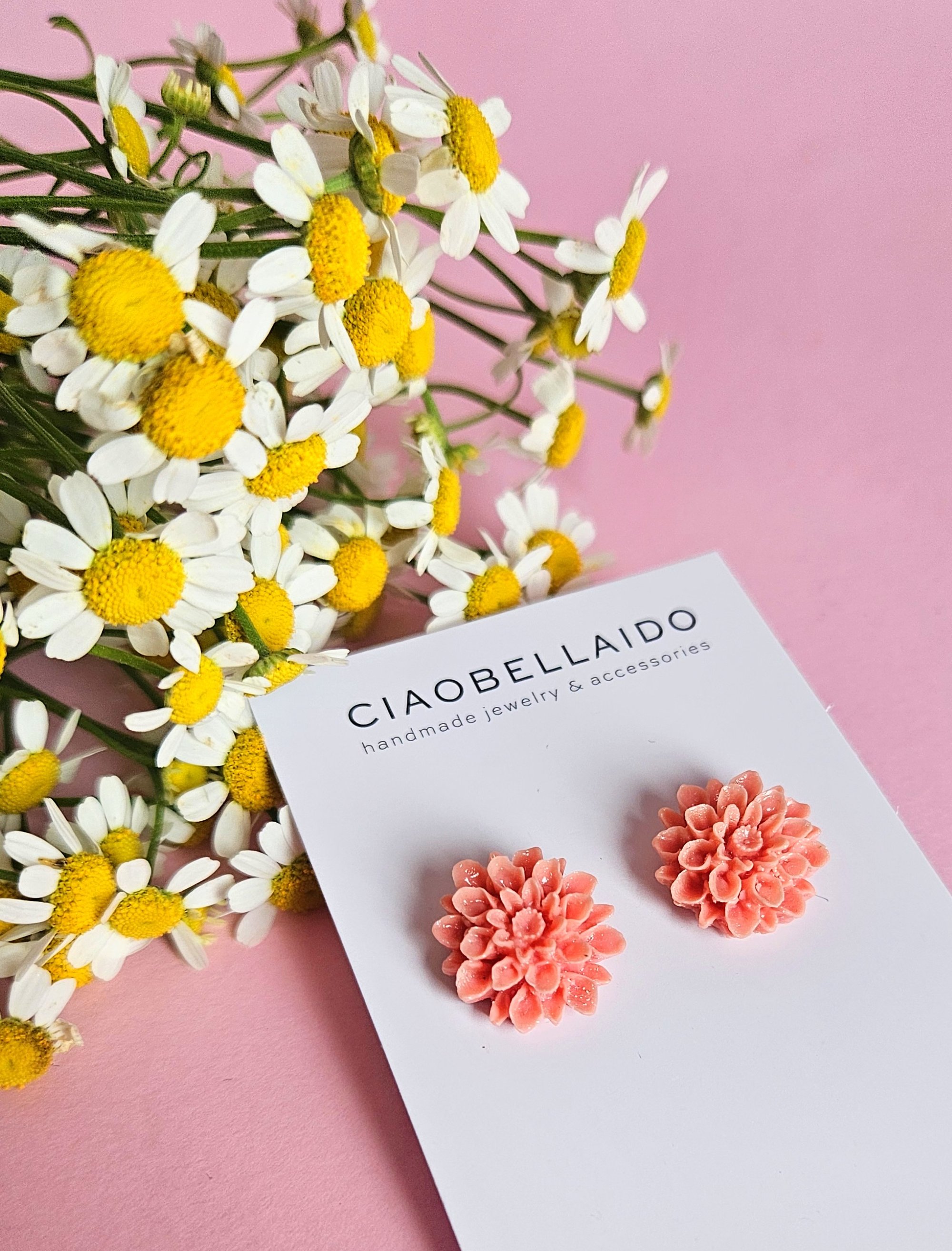 Los pendientes DAHLIA están compuestos por una dahlia en resina de color salmón. Tiene un diámetro de 1,8 cms.