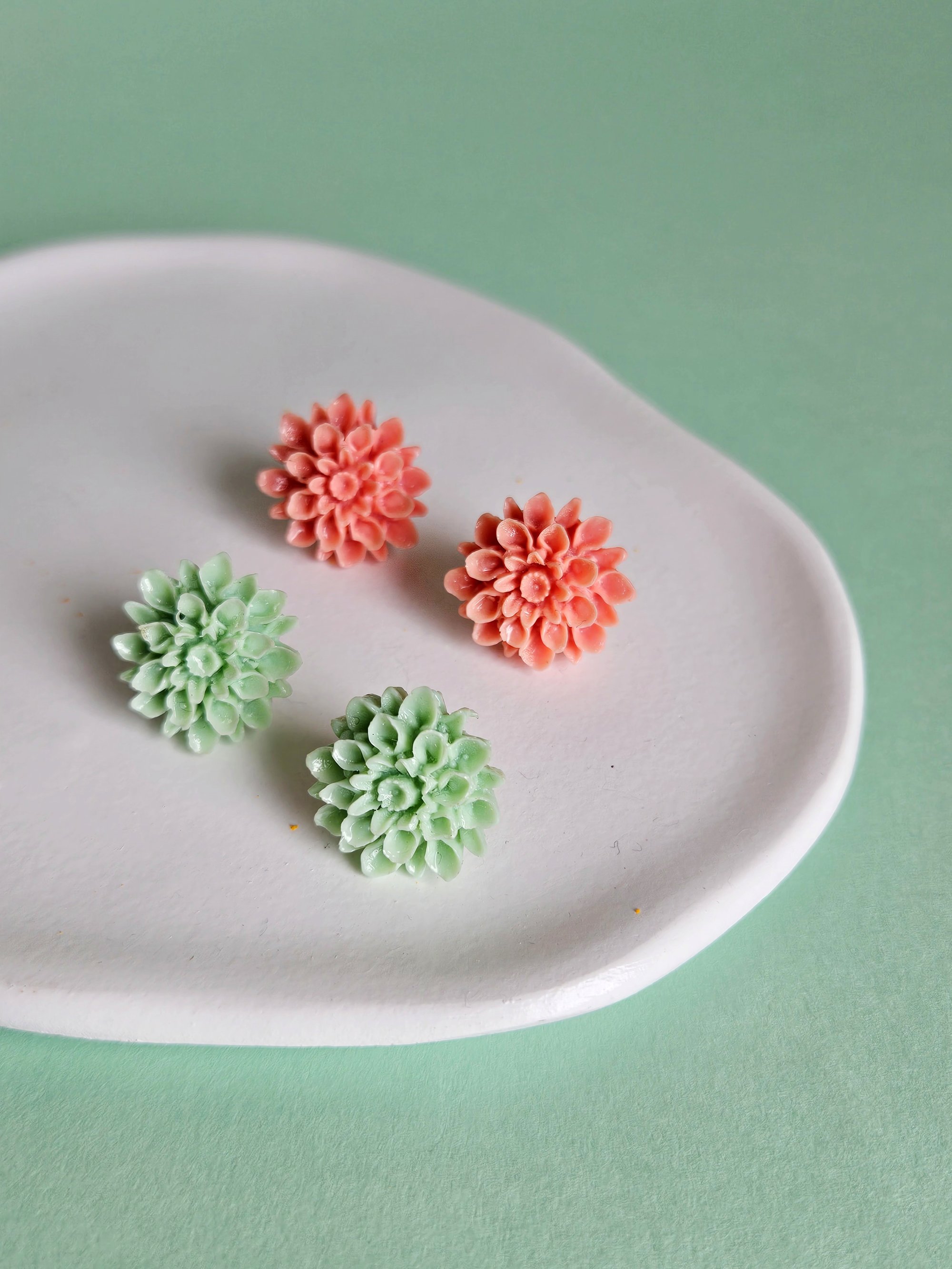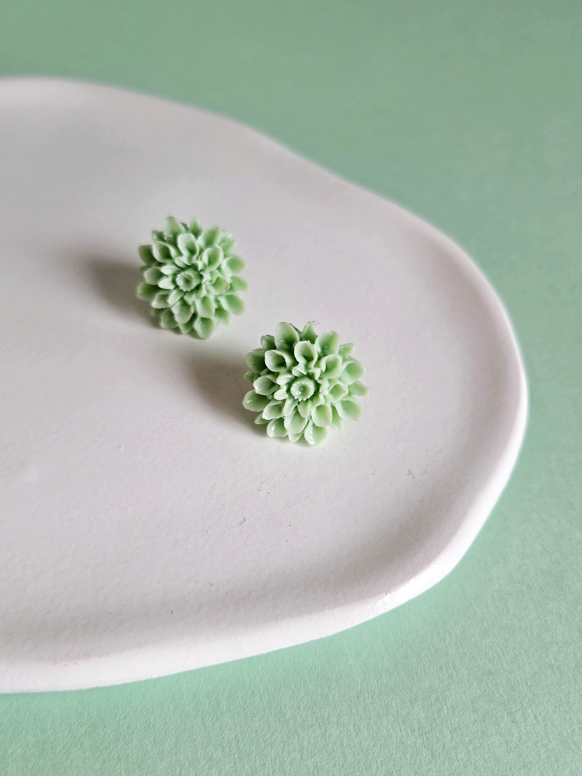 Los pendientes DAHLIA están compuestos por una dahlia en resina de color verde agua. Tiene un diámetro de 1,8 cms.