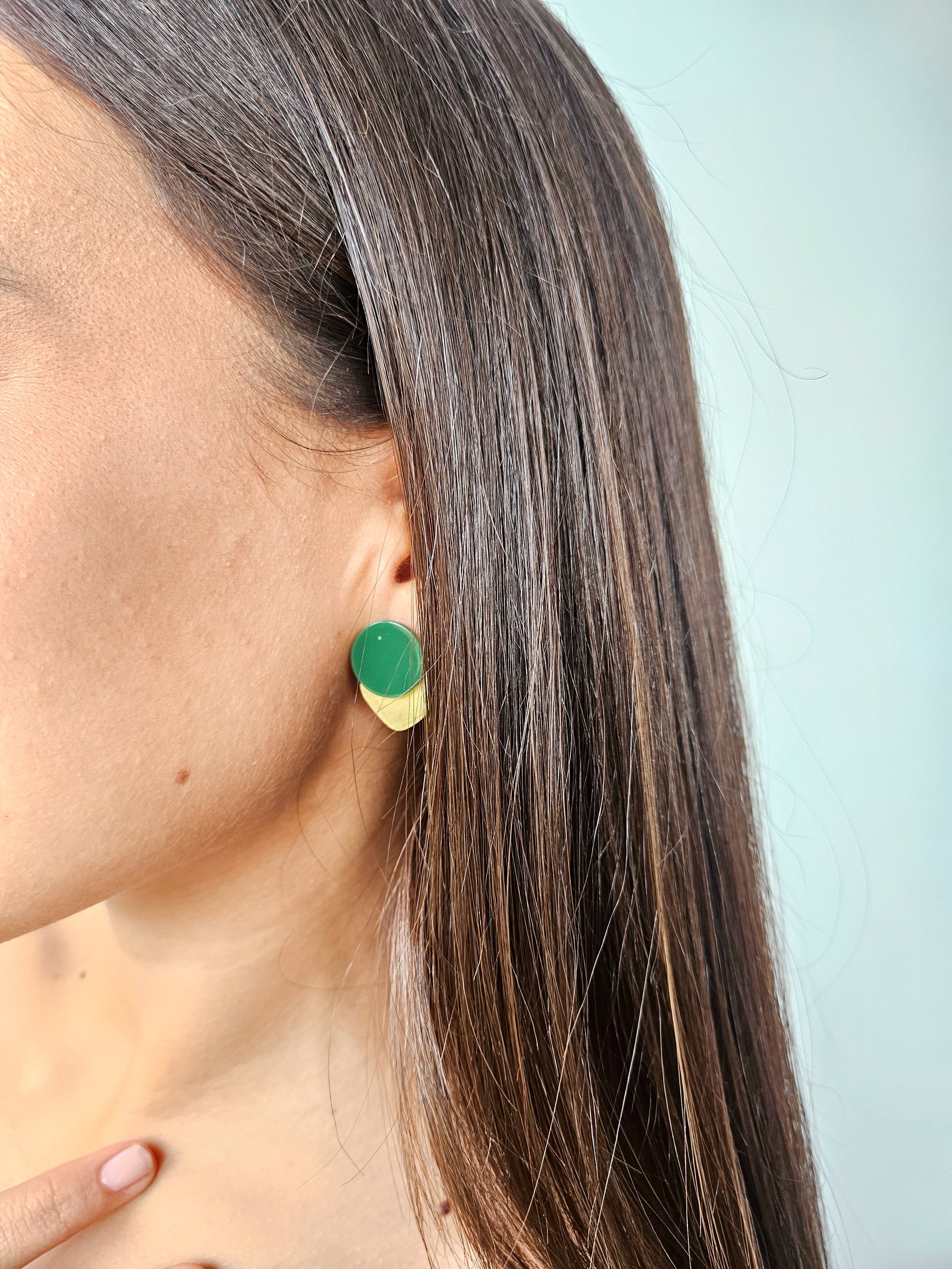 Los pendientes ERIKA están compuestos por una base alargada de latón y una pieza en forma de círculo de color verde. Sus medidas son de 2x1,5 cm. Cierre a presión de latón bañado en oro