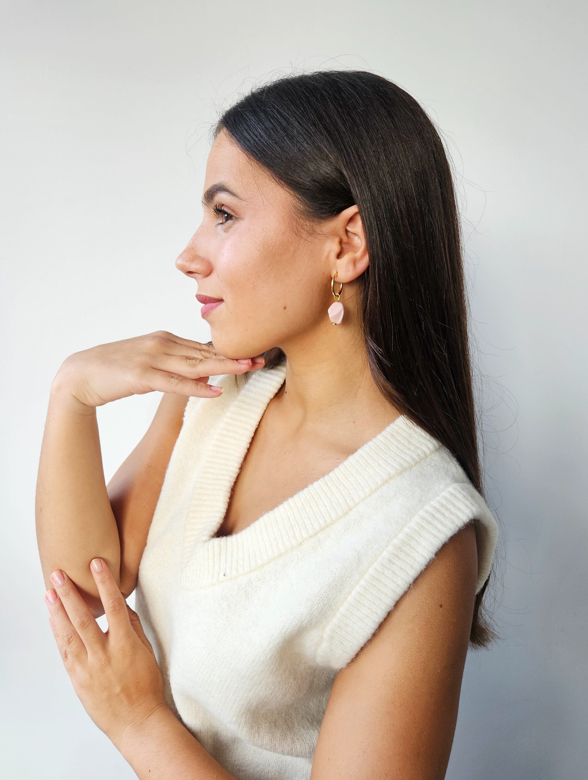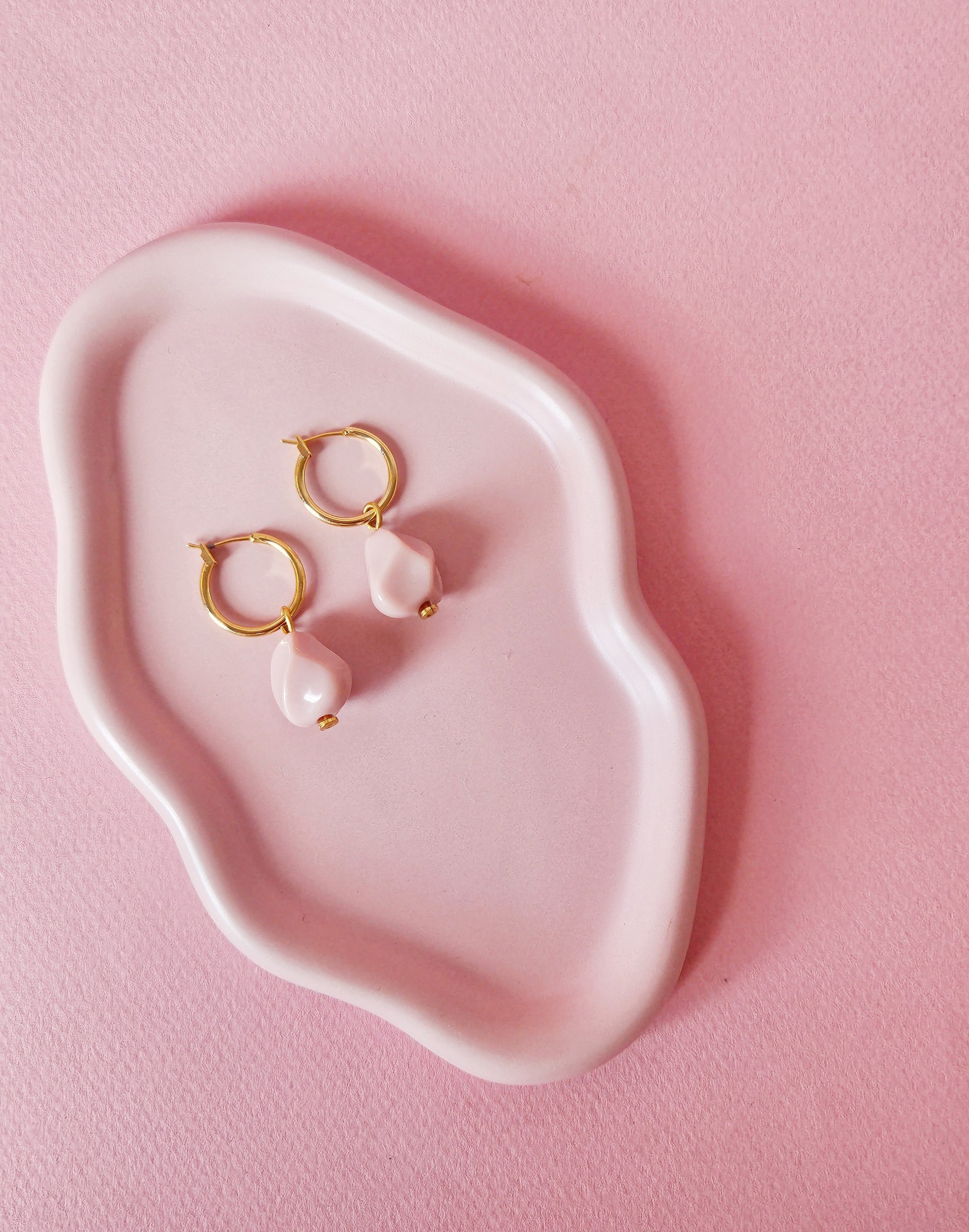 Pendientes de aro pequeño con un diámetro de 1,8 cm. El aro es de latón bañado en oro, libre de níquel y plomo. Están compuestos por una pieza de resina de formas irregulares en tono nude.