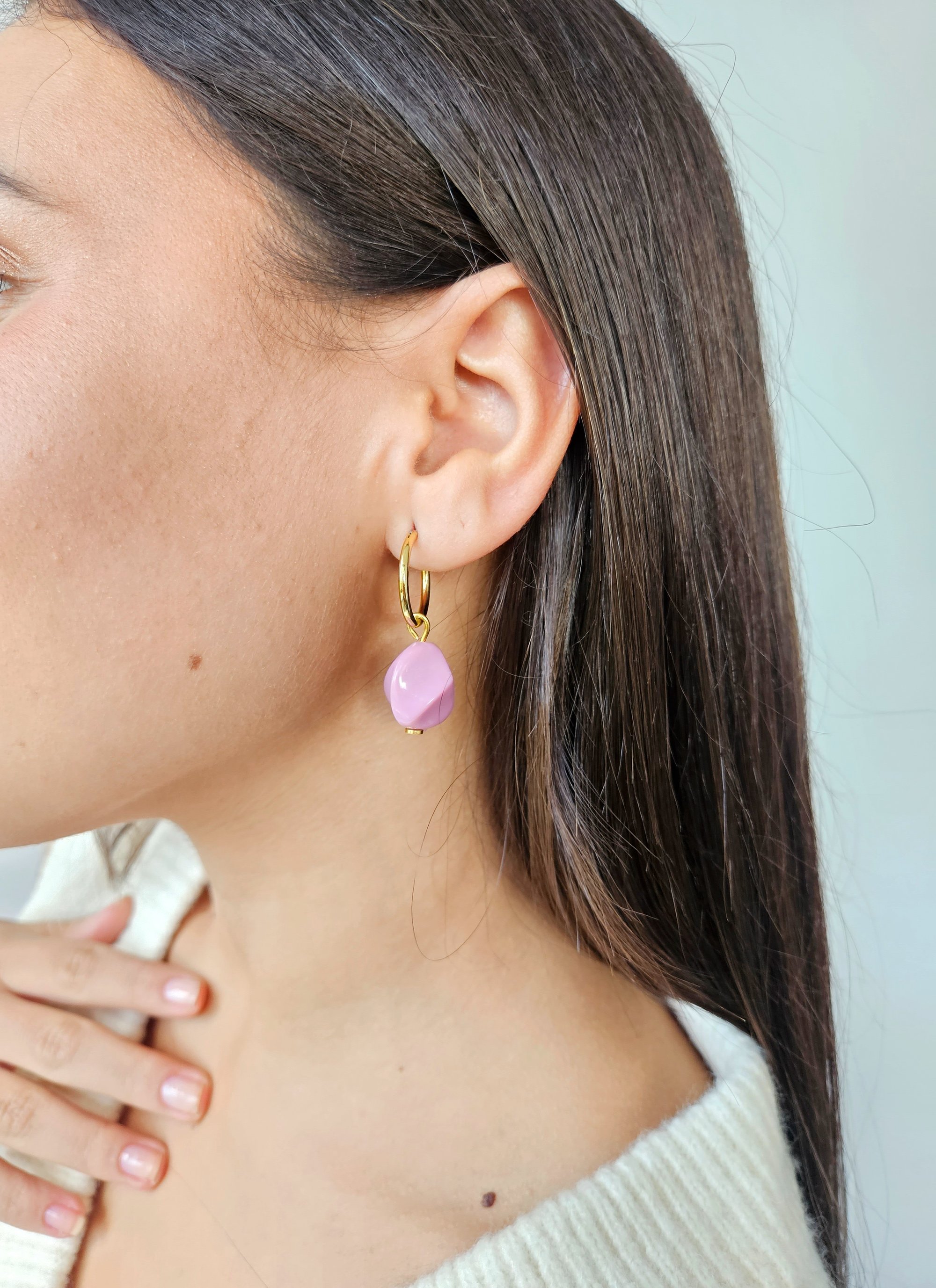 Pendientes de aro pequeño con un diámetro de 1,8 cm. El aro es de latón bañado en oro, libre de níquel y plomo. Están compuestos por una pieza de resina de formas irregulares en tono rosa.