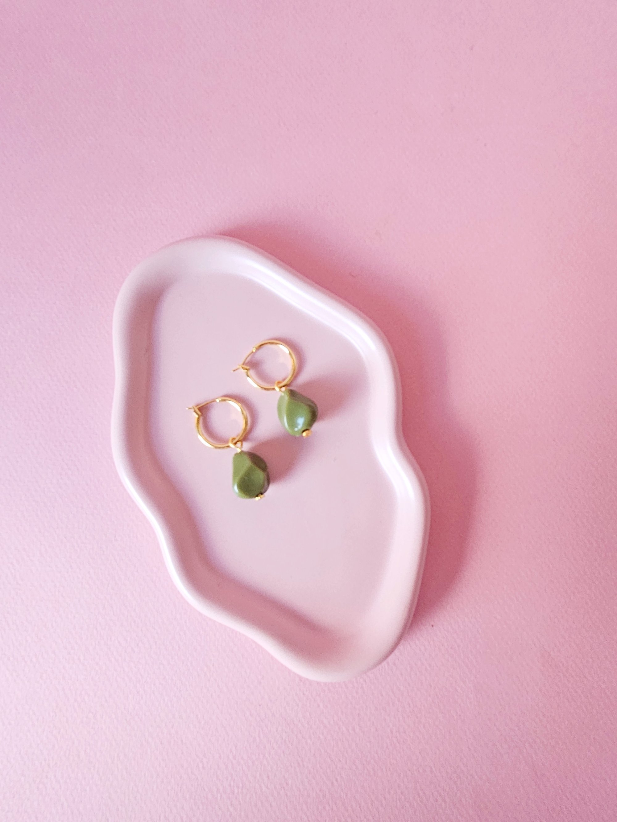 Pendientes de aro pequeño con un diámetro de 1,8 cm. El aro es de latón bañado en oro, libre de níquel y plomo. Están compuestos por una pieza de resina de formas irregulares en tono verde caqui.
