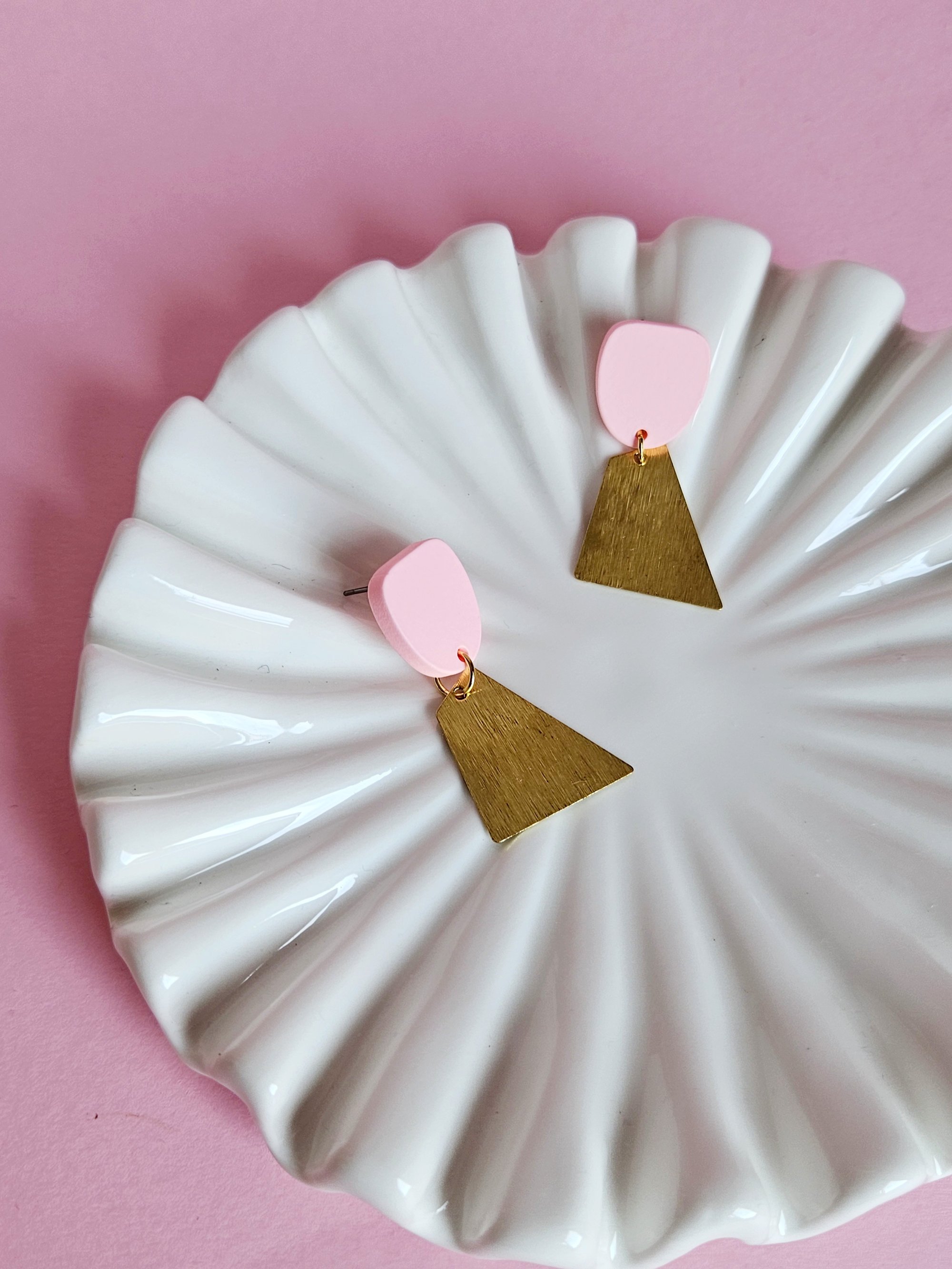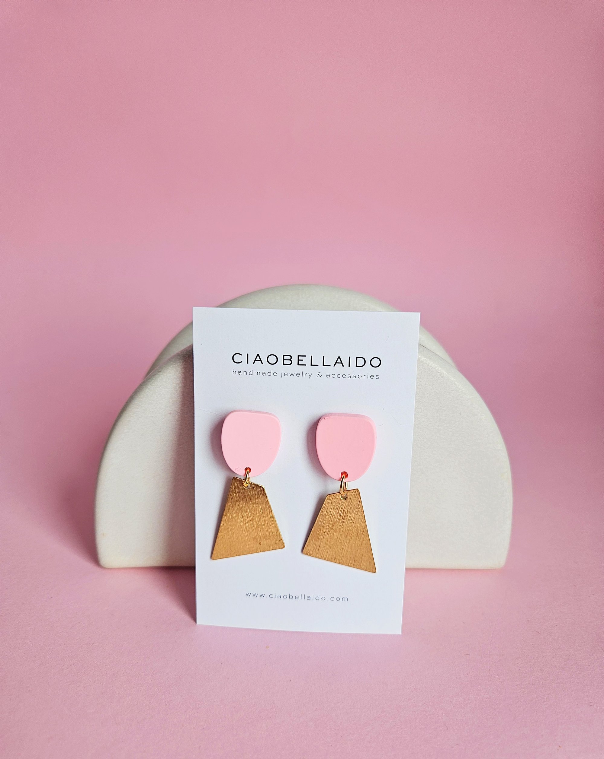 Los pendientes GIULIA están compuestos por una pieza de color en acrílico y una pieza geométrica de latón. Muy ligeros. Sus medidas son 5x2 cm. Cierre a presión de latón bañado en oro, libre de níquel y plomo