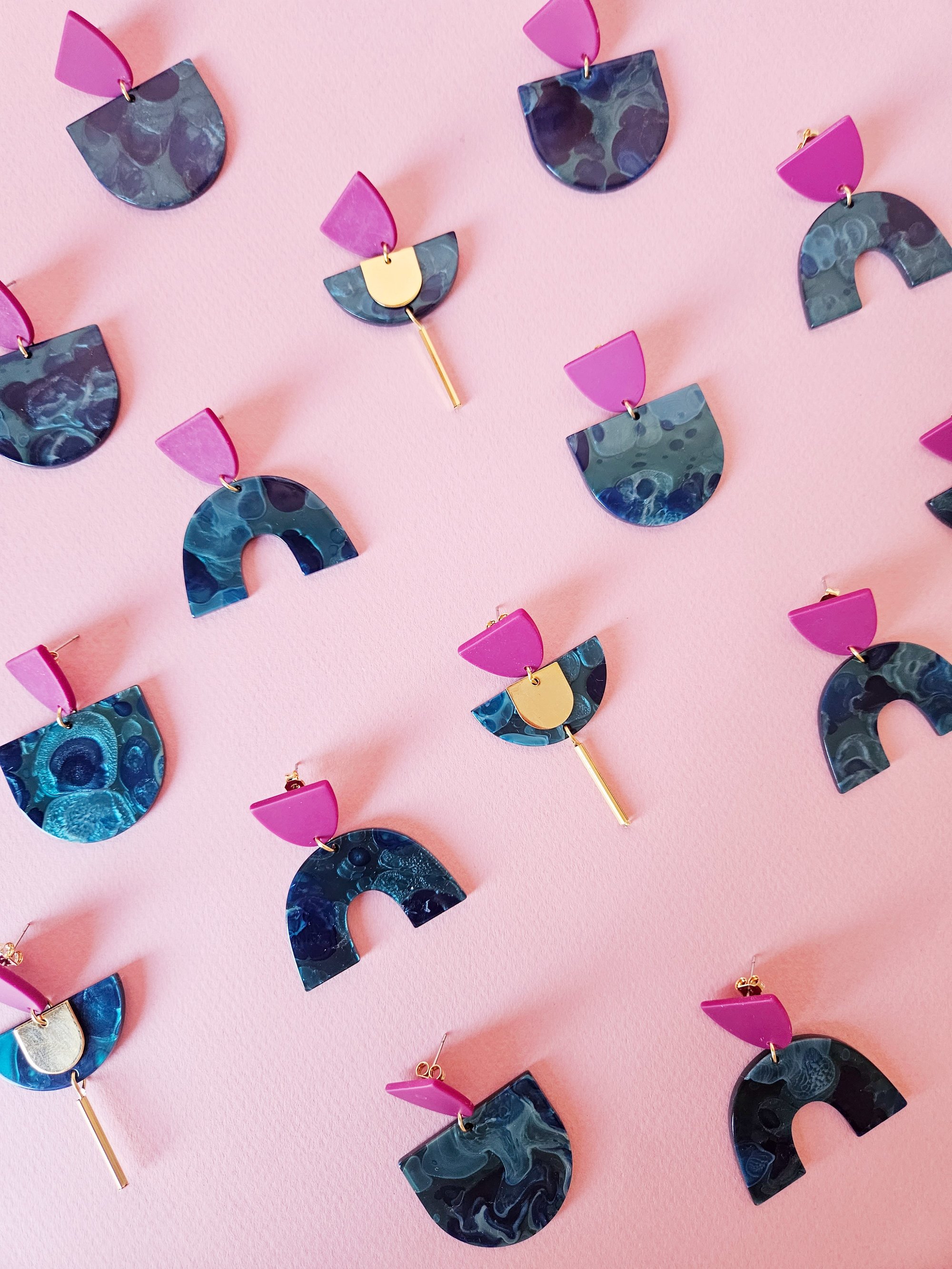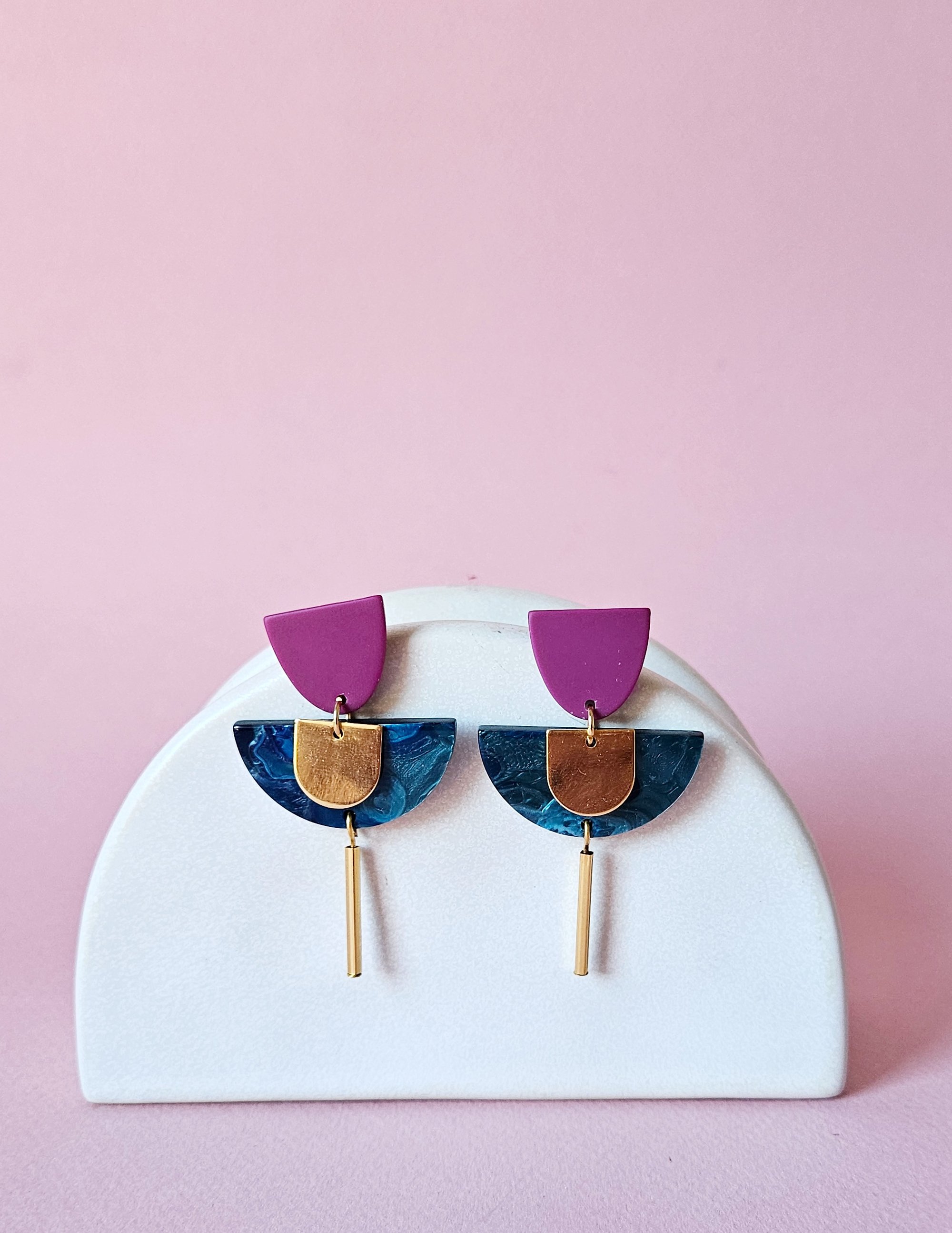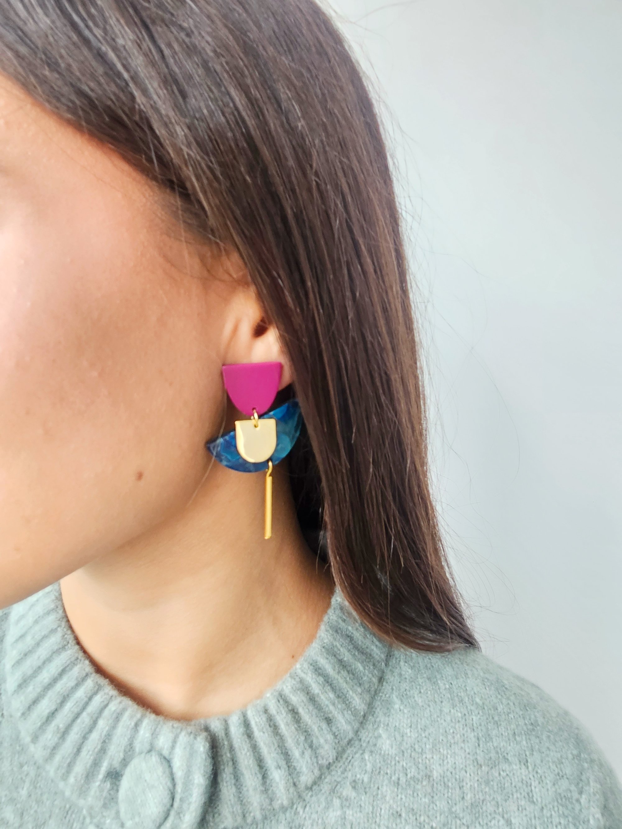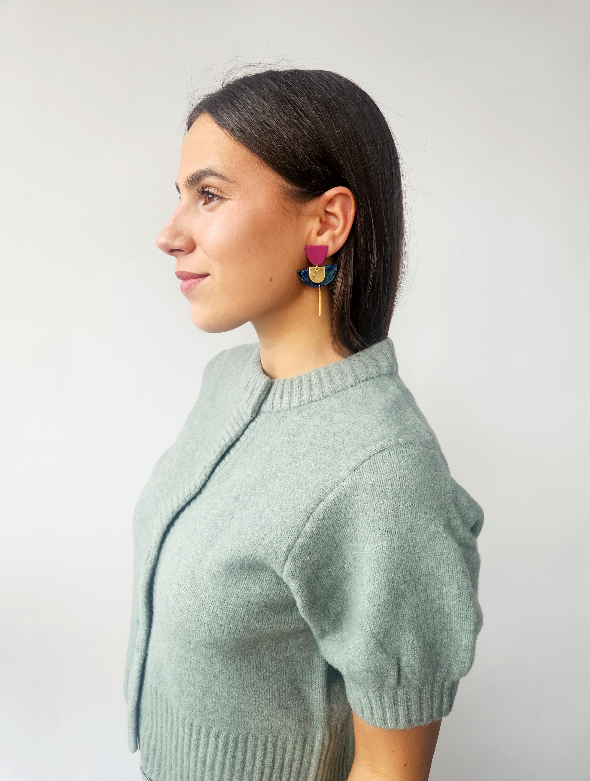 Los pendientes INDIA- GOLD están compuestos por dos piezas de resina en tonos verde azulado y berenjena, junto a varias piezas doradas . Cierre a presión de latón bañado en oro, libre de níquel y plomo. Medida 5.5x3.2cm
