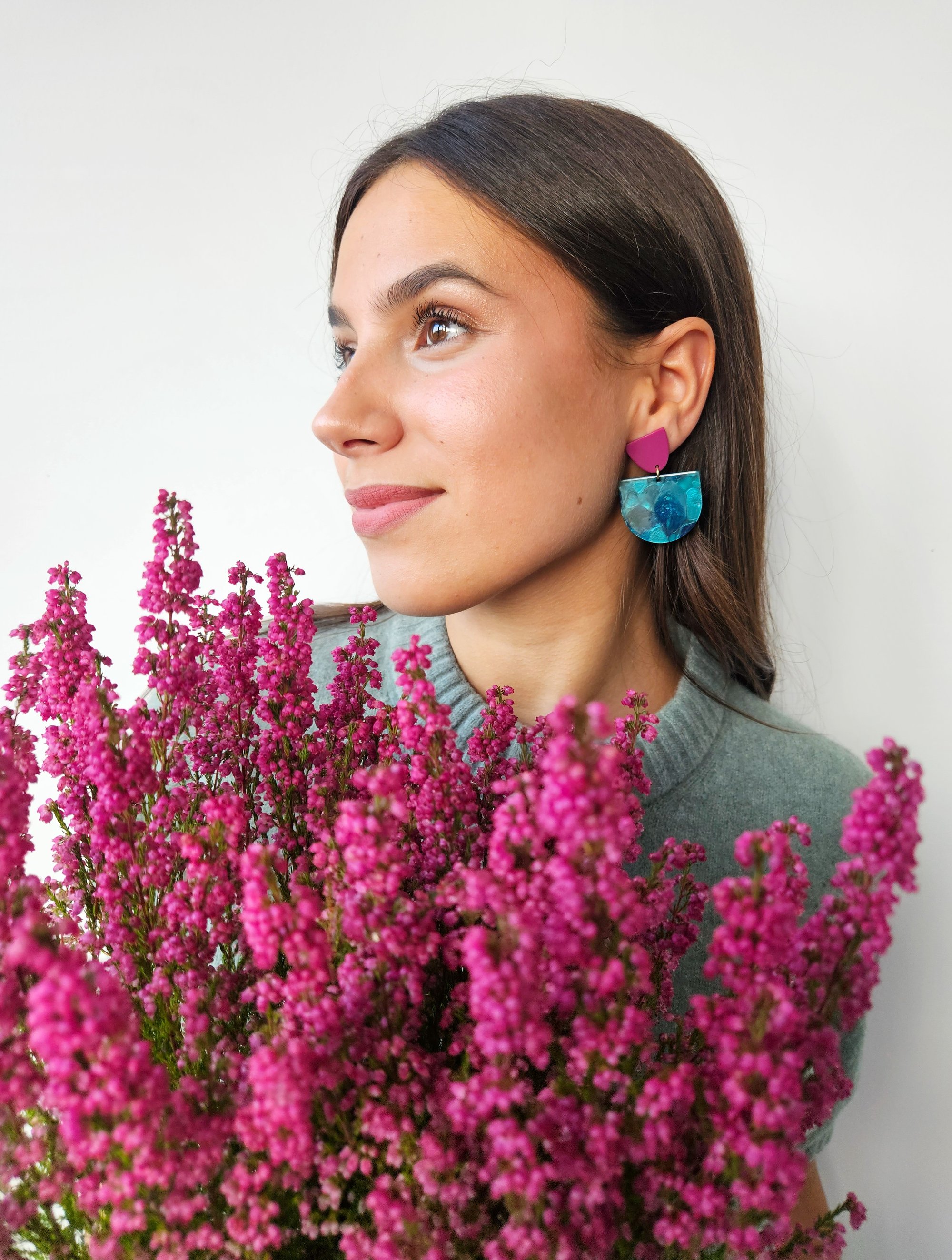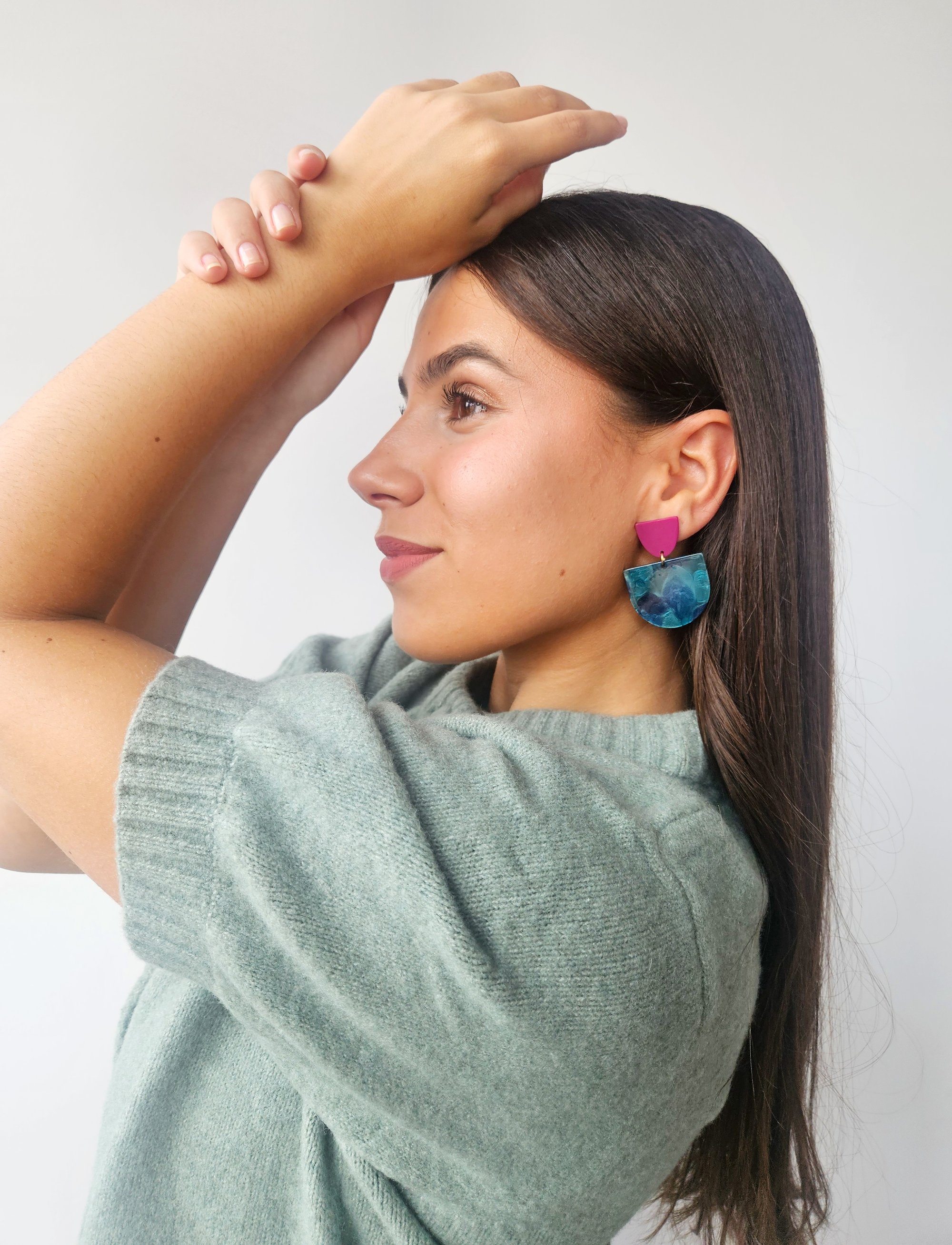 Los pendientes INDIA-SEMIOVAL están compuestos por dos piezas de resina en tonos verde azulado y berenjena. Cierre a presión de latón bañado en oro, libre de níquel y plomo. Medida 3.4x4.4 cm