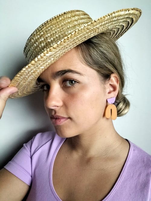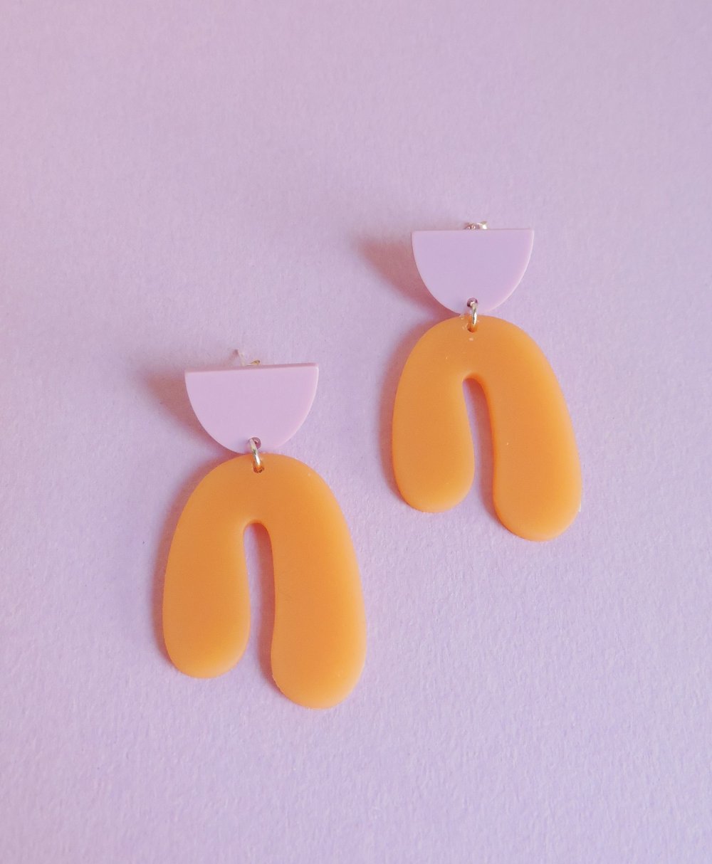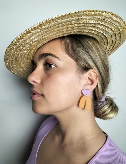 Los pendientes Iris están compuestos por dos piezas con textura mate en tonos lila y naranja.