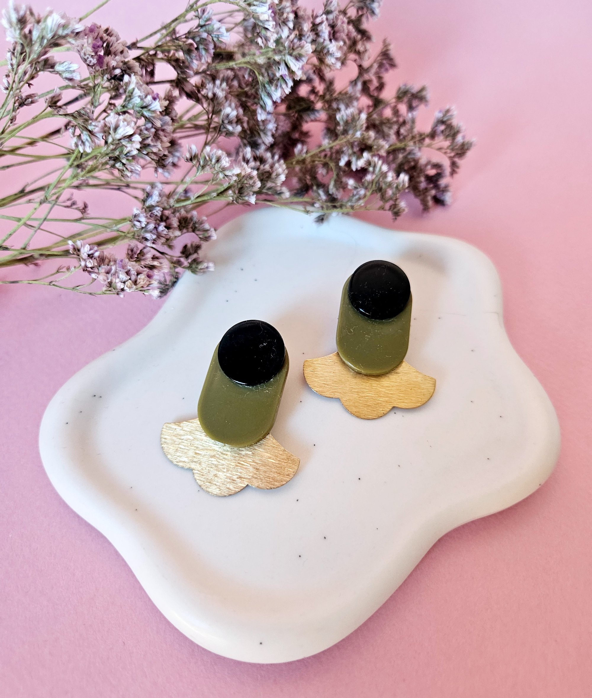 Los pendientes IZADI están compuestos por una pieza de latón con formas onduladas, junto a dos piezas de resina en tonos verde caqui y negro. Son muy ligeros.