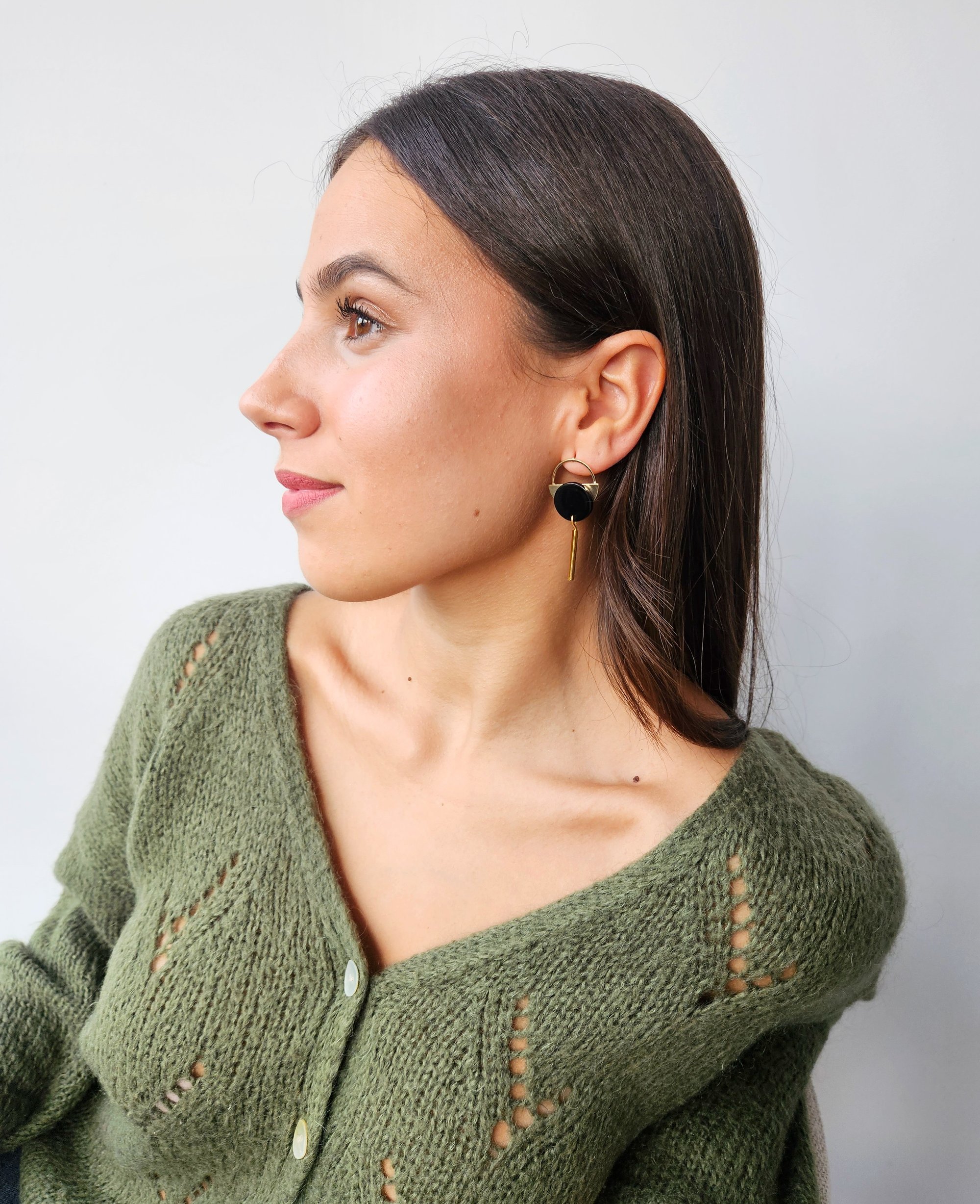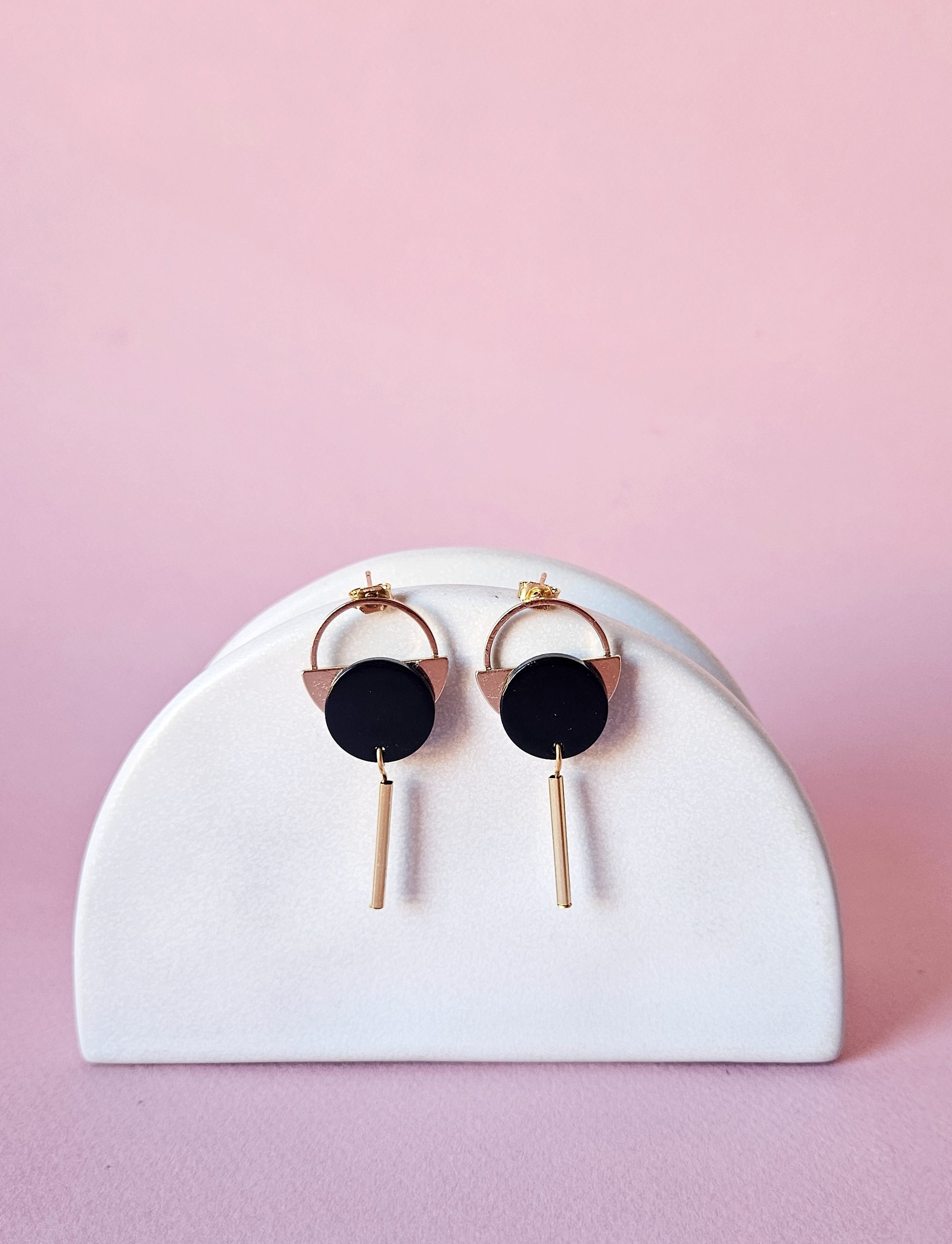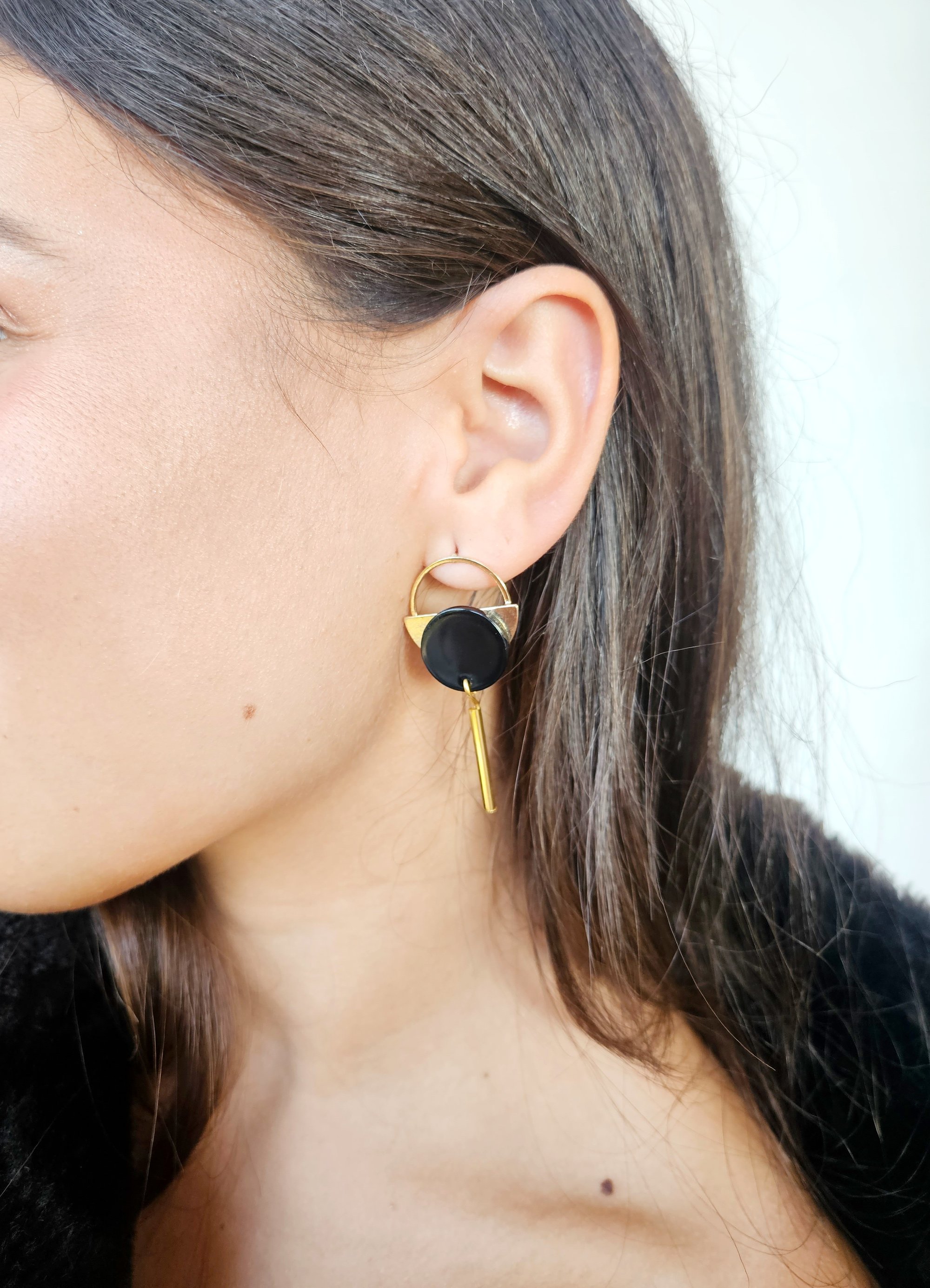Los pendientes KALA - NEGRO están compuestos por una base circular en latón bañado en oro, junto a una pieza de resina en tono negro. Cierre a presión en latón bañado en oro, libre de níquel y plomo. Sus medidas son de 4,7x2,2 cms