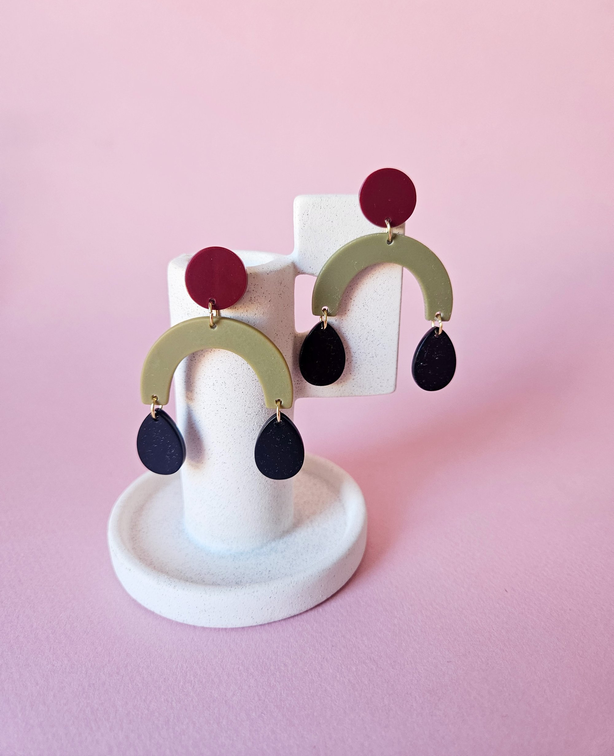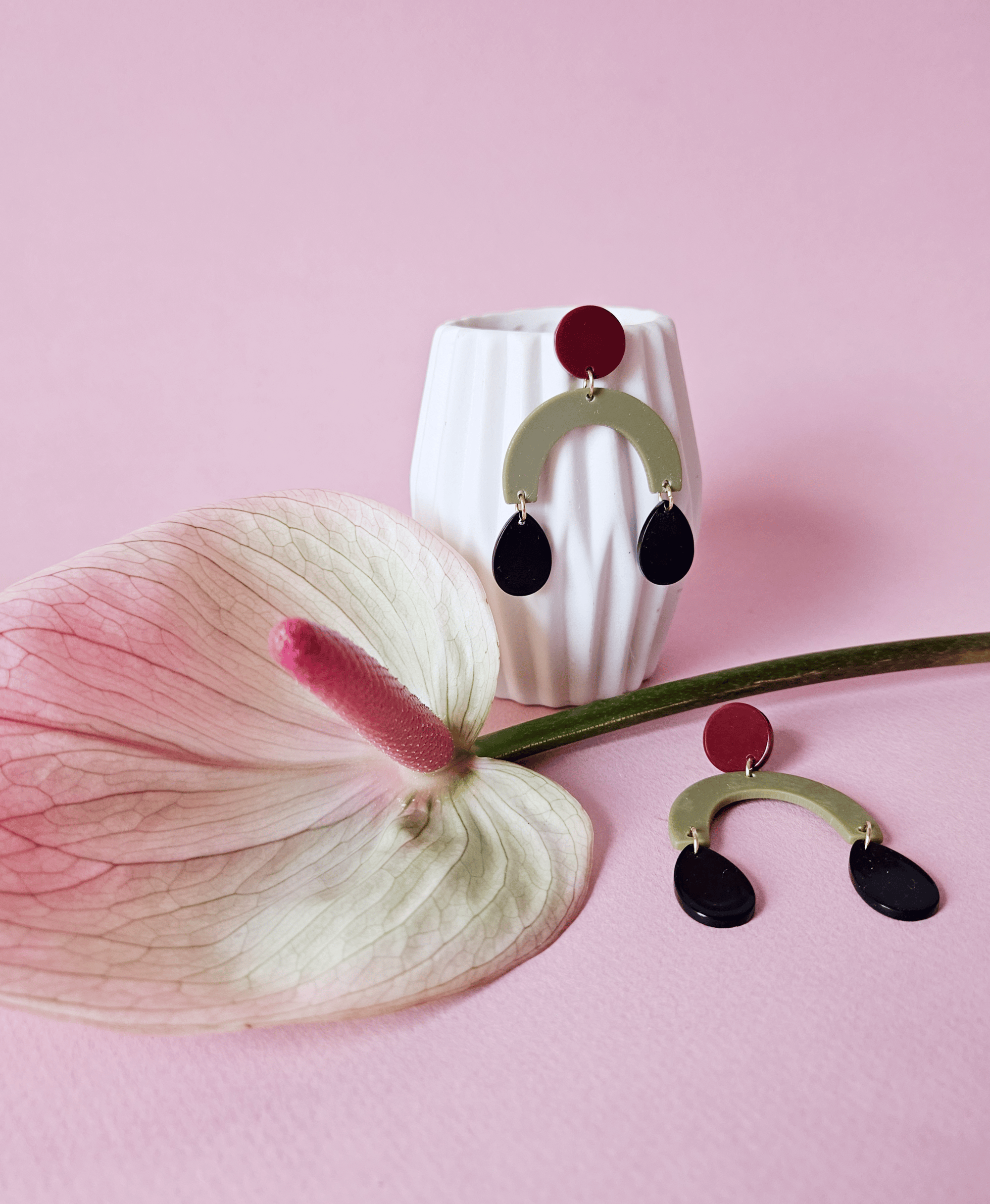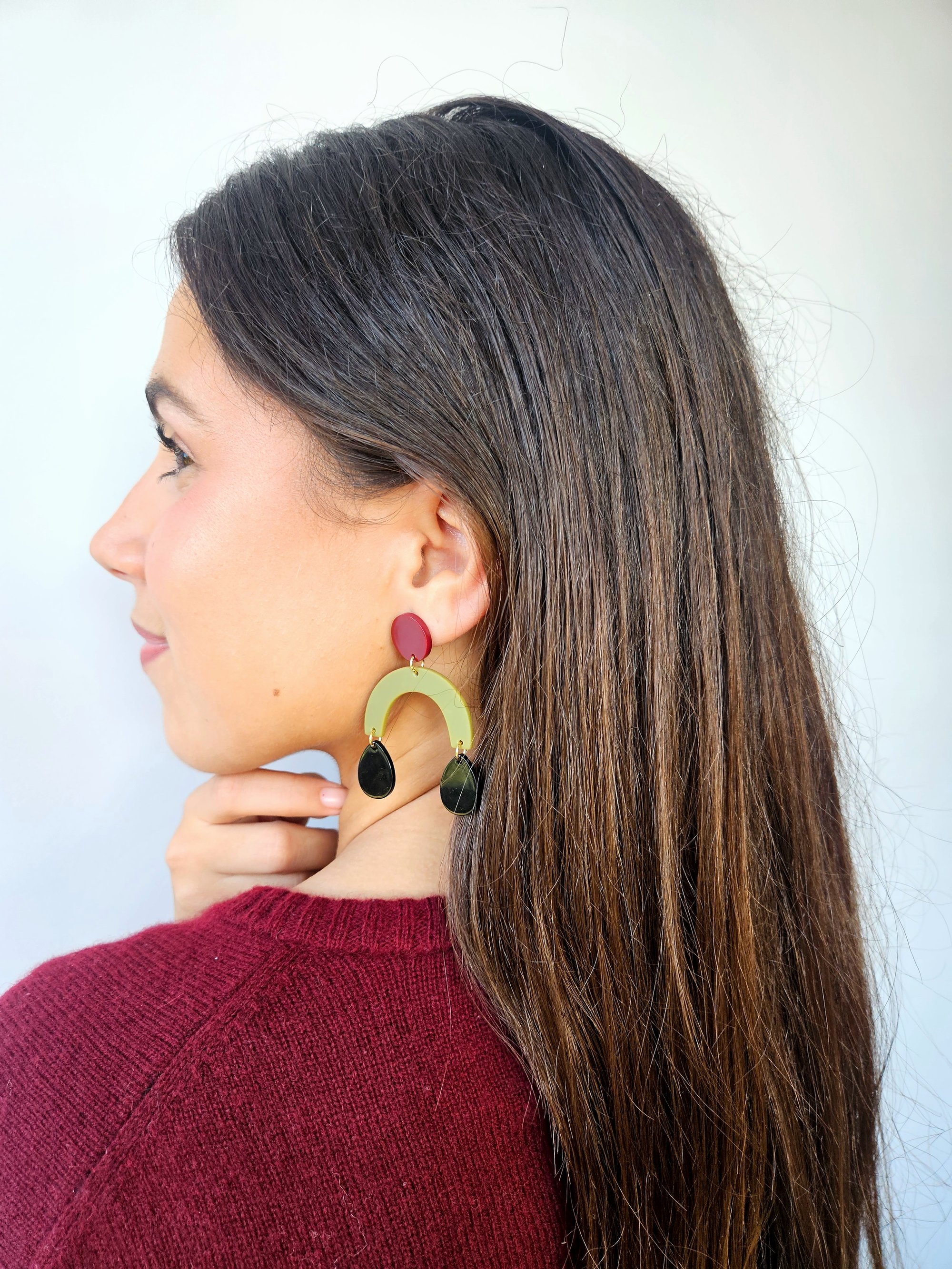 Los pendientes MINA están compuestos por varias piezas de resina en tonos verde caqui, granate y negro. Su medidas son de 3,8x5,5 cm. Son muy ligeros.