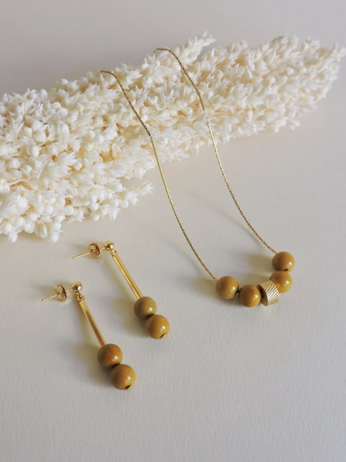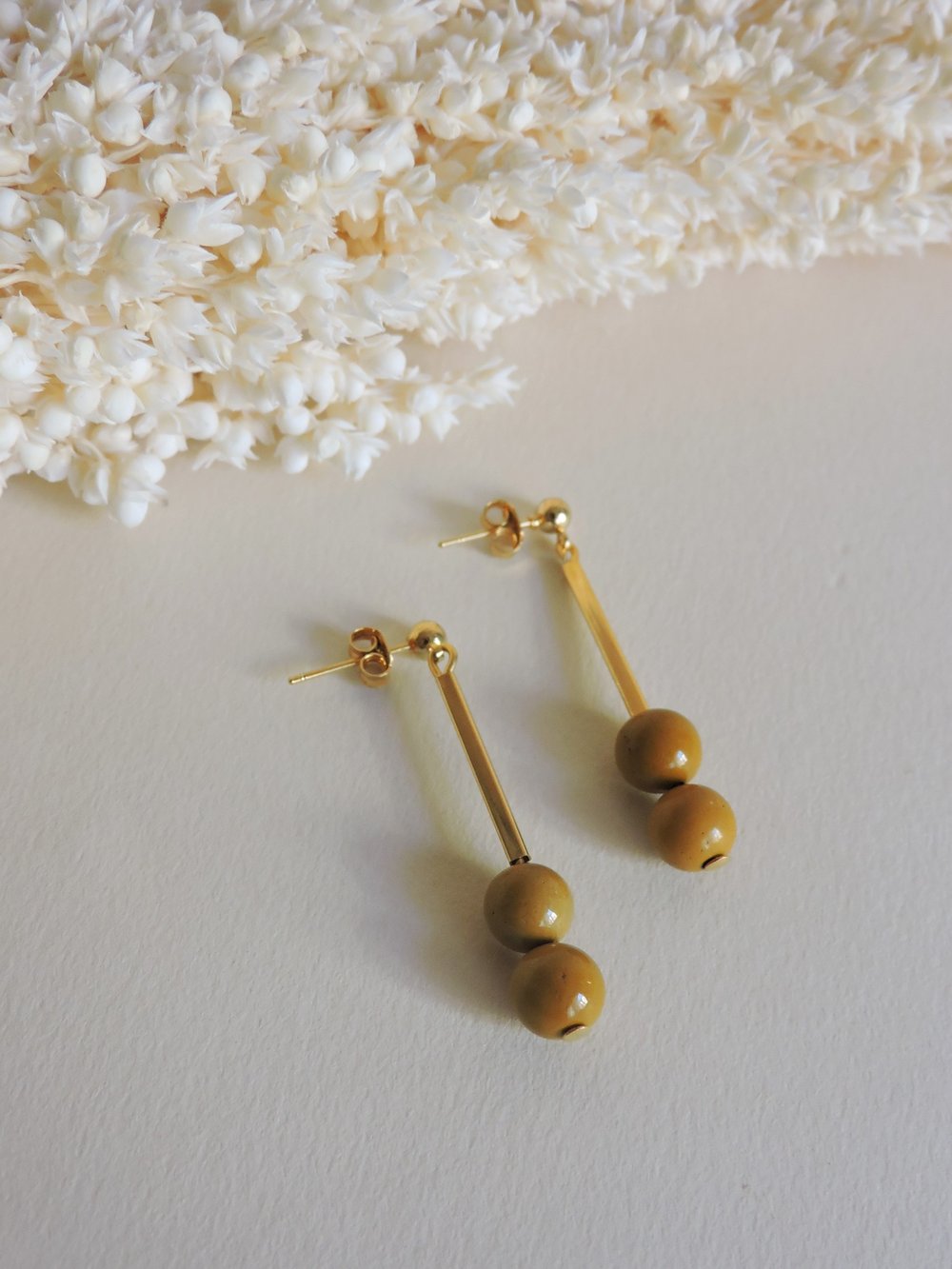 Los pendientes LEA están compuestos por varias piedras naturales de Mookaita y una pieza alargada de latón bañada en oro. Lleva un cierre a presión de latón bañado en oro (libre de níquel y plomo). Su medida aproximada es de 4 cms