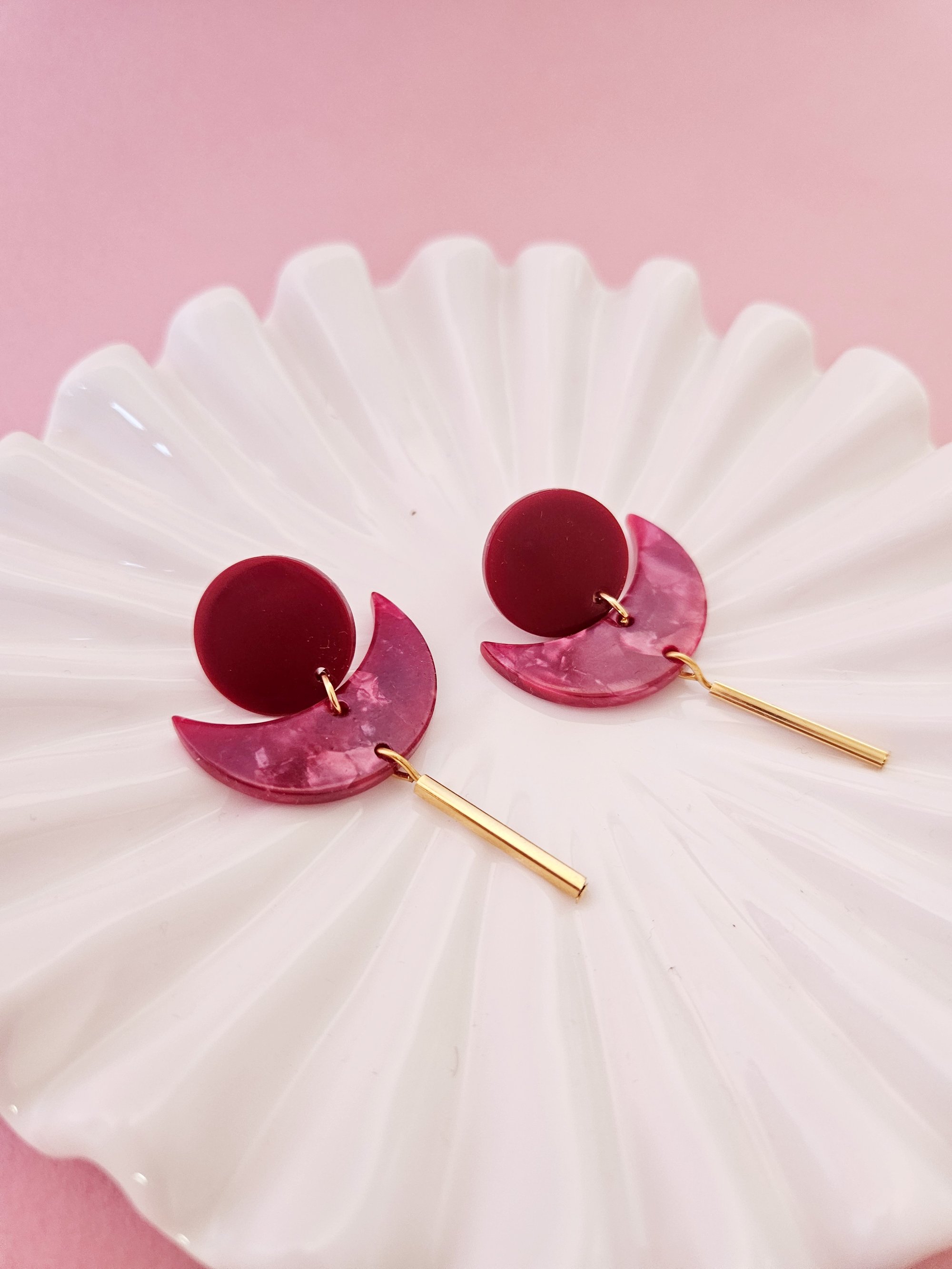 Los pendientes MAIA están compuestos por dos piezas de resina de formas geométricas y una pieza de latón alargada bañada en oro.