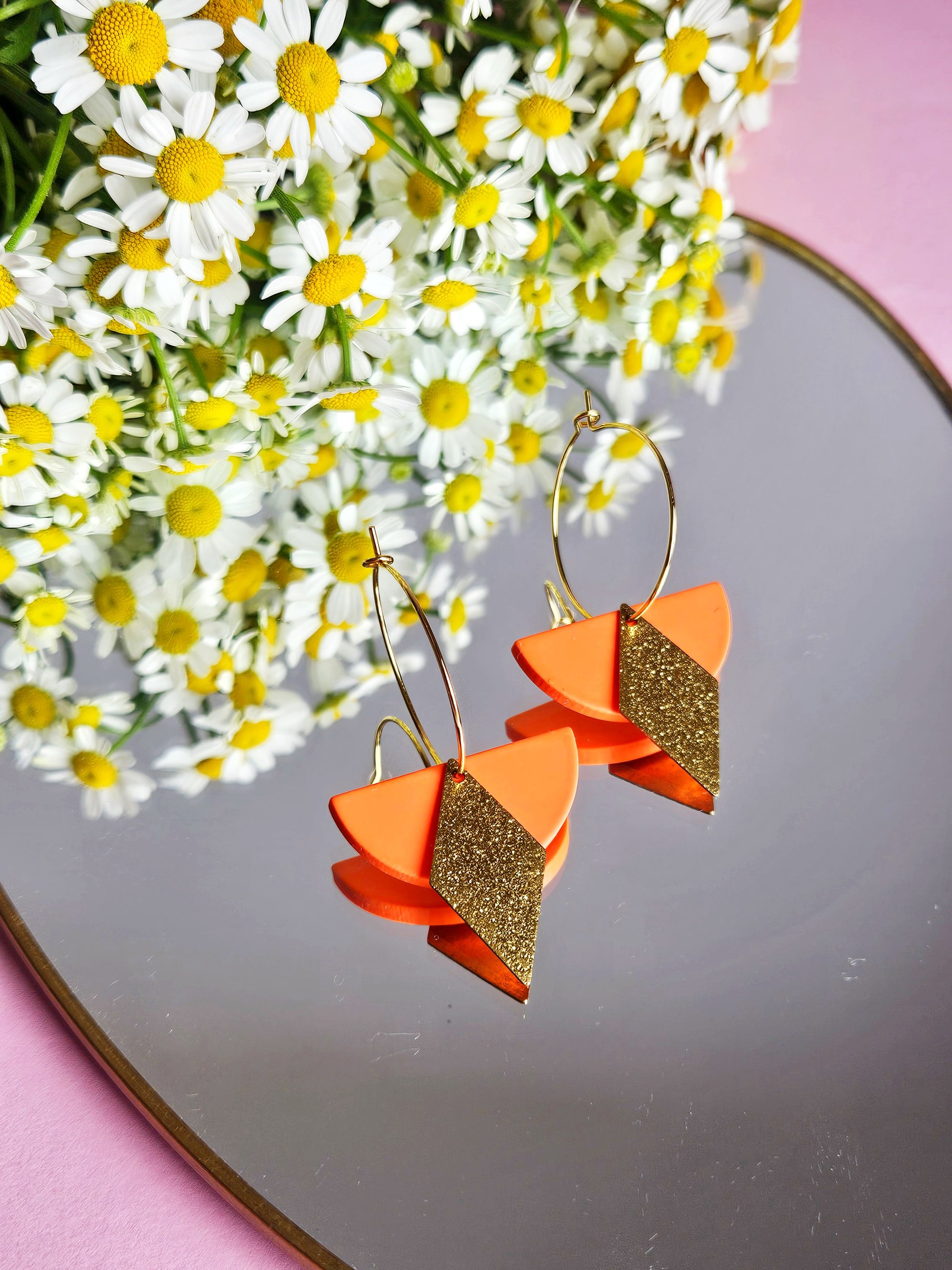 Los pendientes MIA están compuestos por un aro junto a una pieza de acrílico en color y una pieza con forma de rombo de latón. El aro tiene un diámetro de 2,5 cm y es de latón bañado en oro, libre de níquel y plomo
