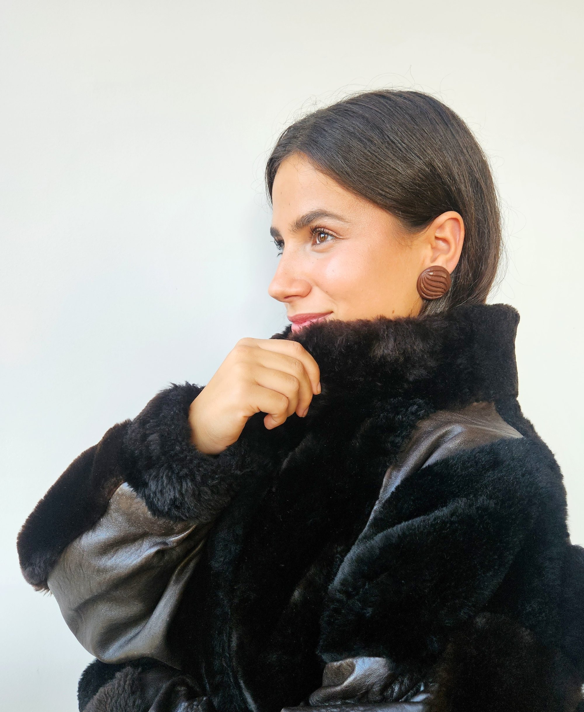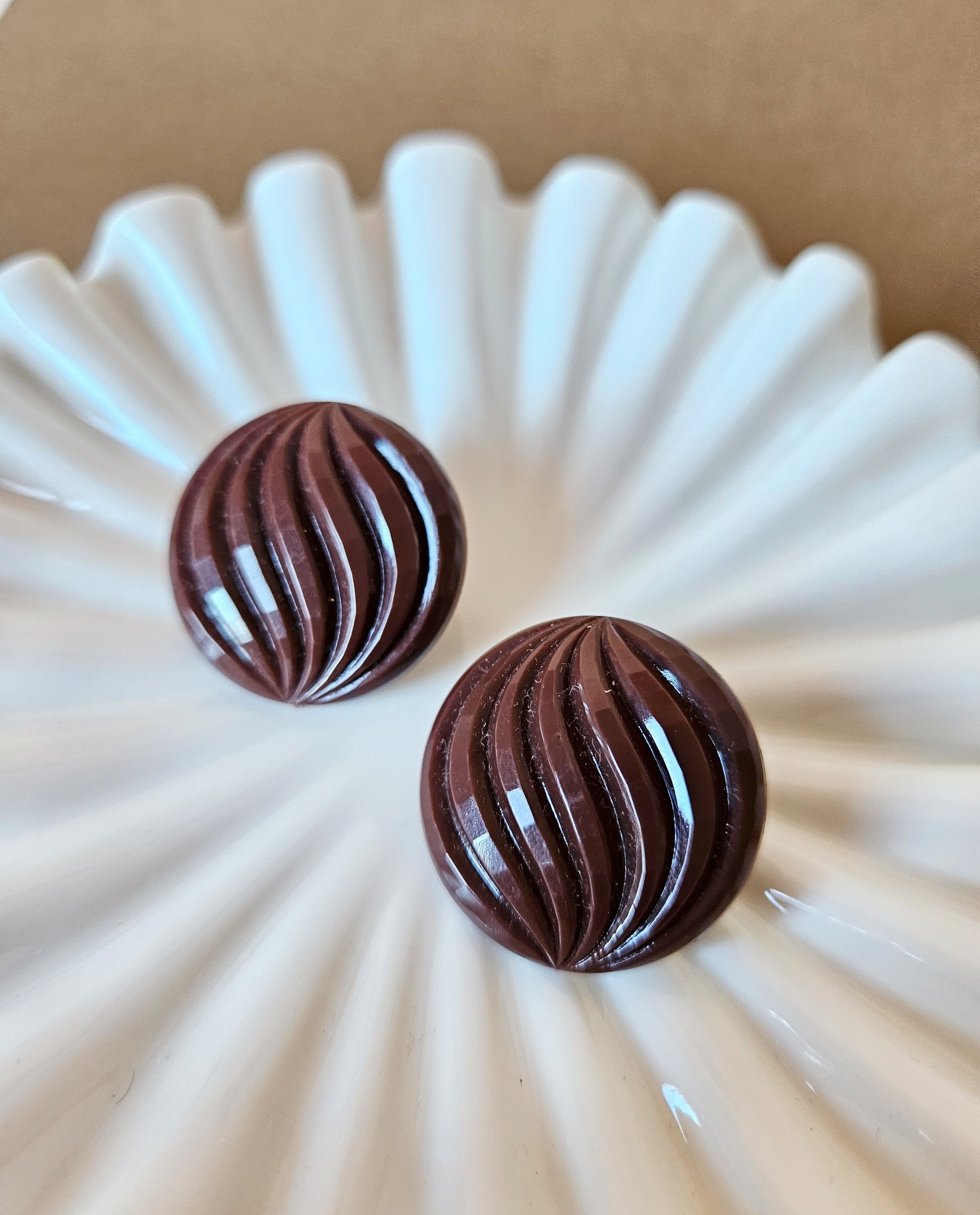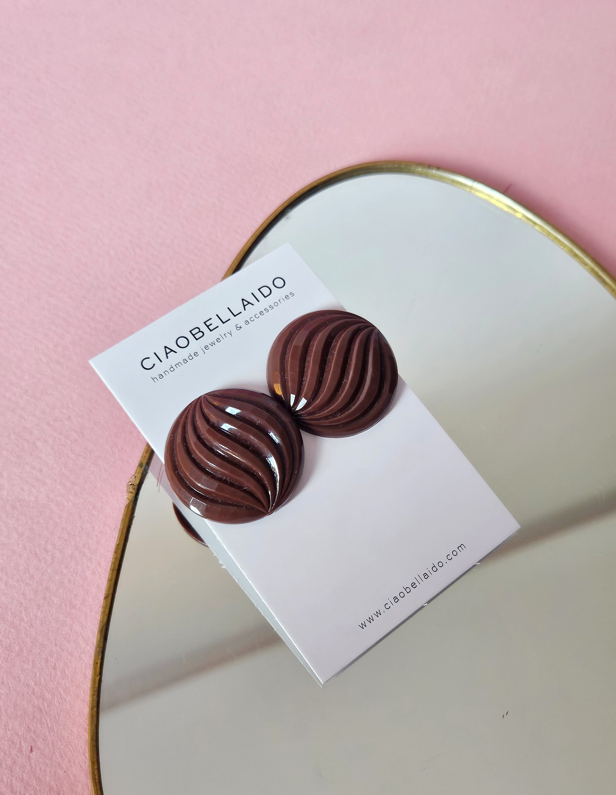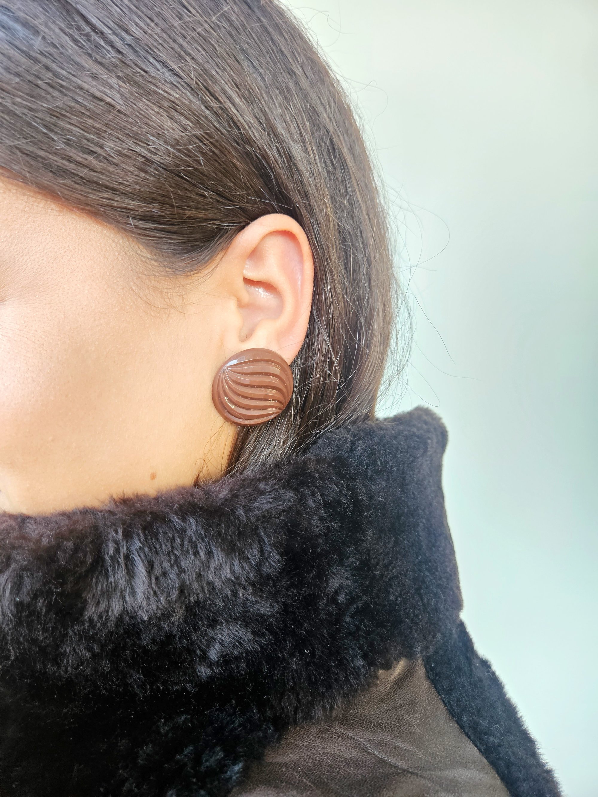 Los pendientes MOKA están compuestos por un cabuchón vintage de resina en tono marrón chocolate . Tiene un diámetro de 3 cm. Cierre a presión de latón bañado en oro, libre de níquel y plomo