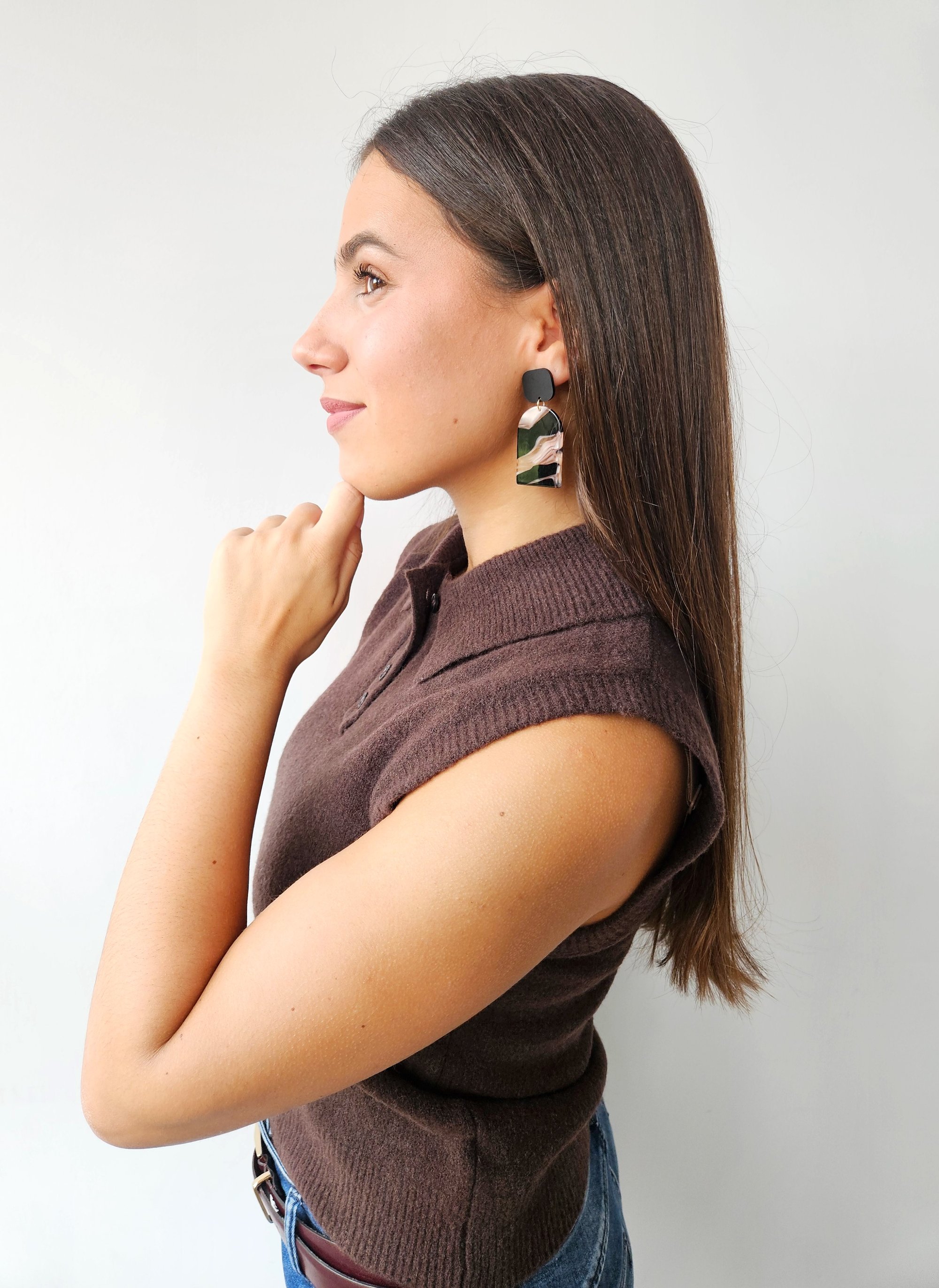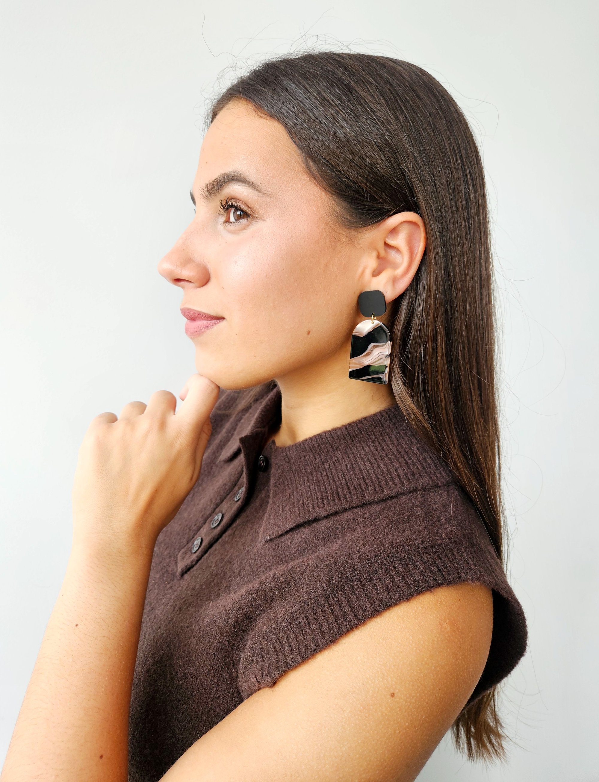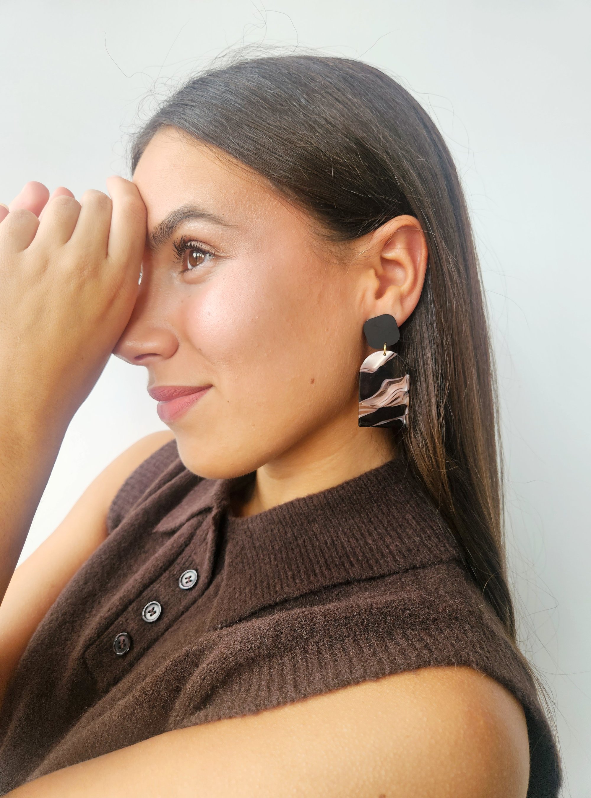 Los pendientes KENYA están compuestos por una pieza cuadrada de resina en tono negro con textura mate , junto a otra pieza en tonos beiges y negros