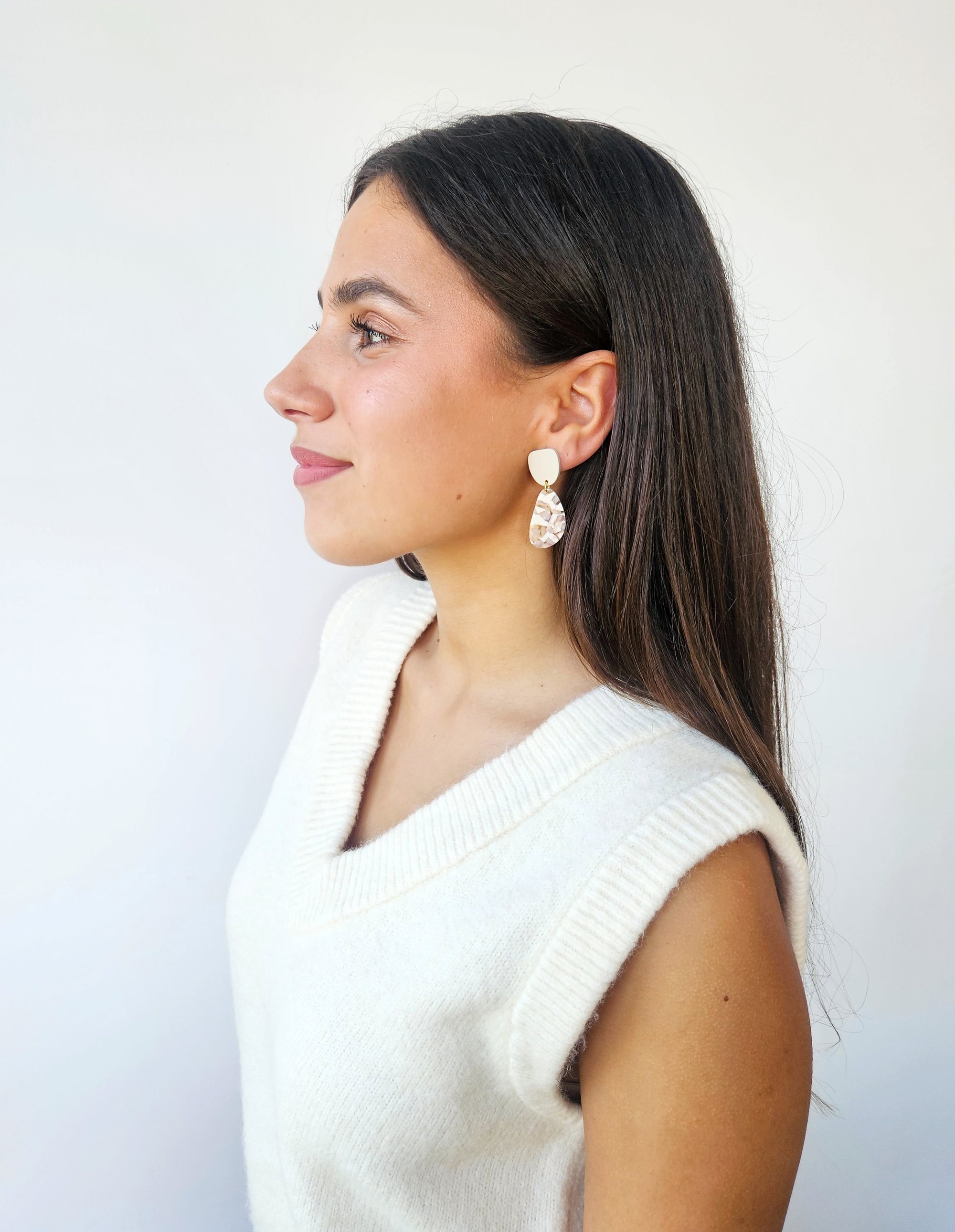 Los pendientes VAINILLA están compuestos por una pieza de resina en tonos beige crema y una parte superior en tono beige con textura mate. Sus medidas son de 4,5 x 1,5 cm. Cierre a presión de latón bañado en oro, libre de níquel y plomo
