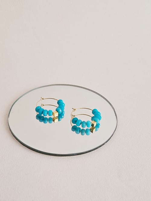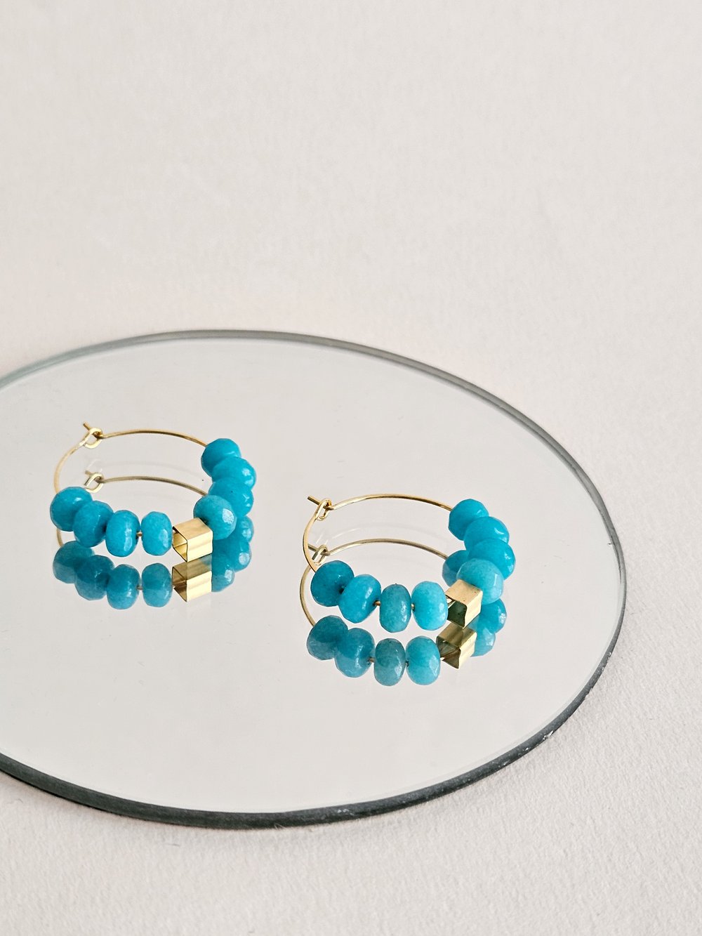 Pendientes de aro pequeño con un diámetro de 2,5 cm. El aro es de latón bañado en oro, libre de níquel y plomo. Están compuestos por varias piedras de ágata en tono turquesa y una pieza central de latón bañado en oro.